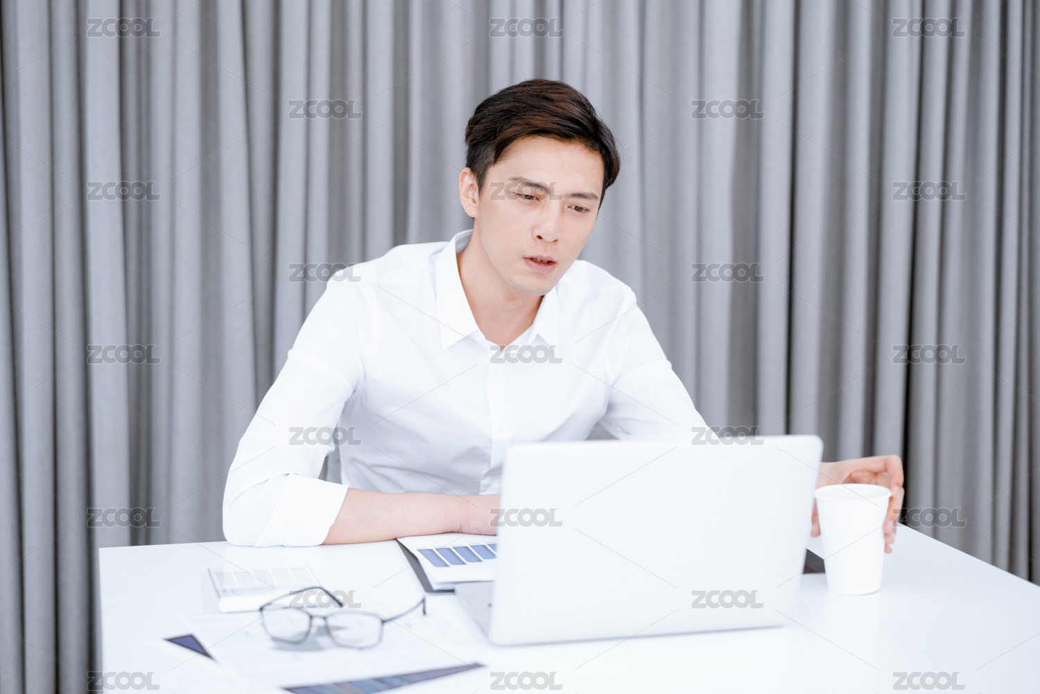 穿白色衬衣使用笔记本电脑工作的年轻男性
