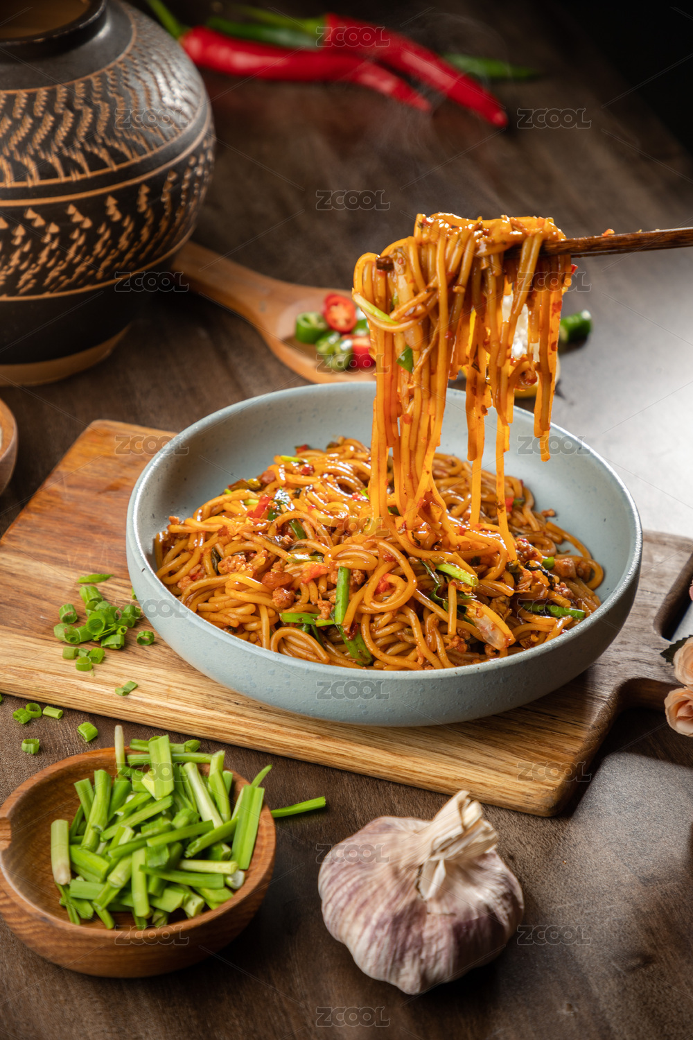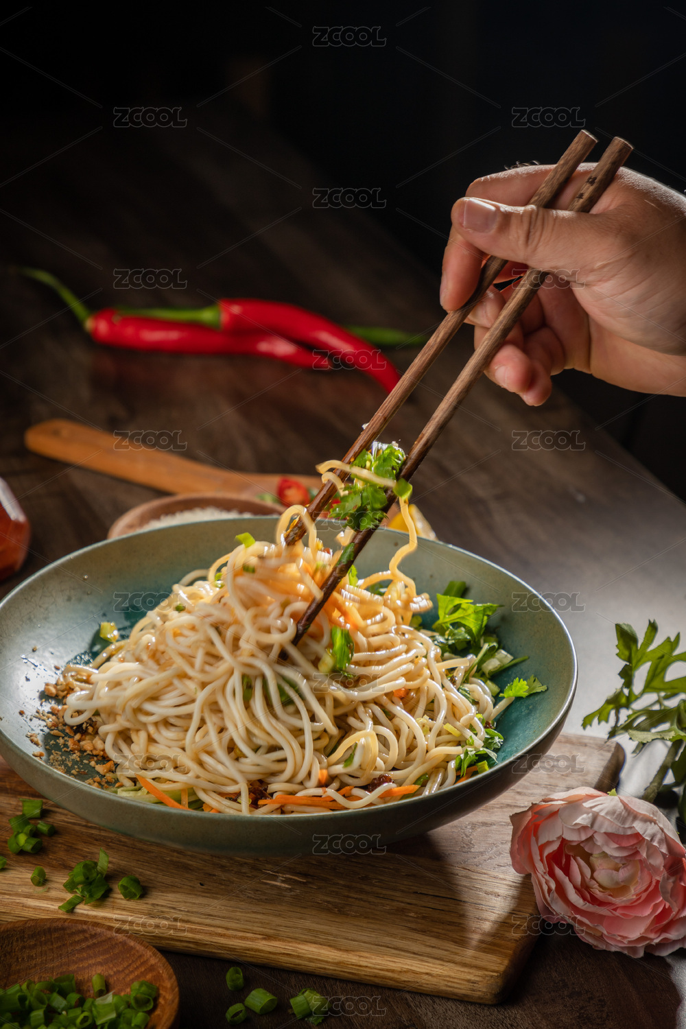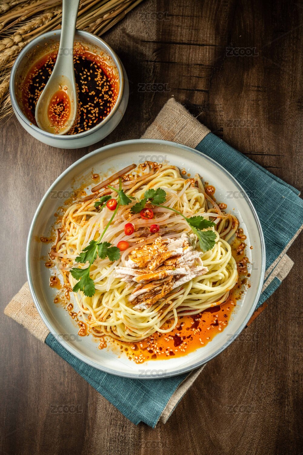 棕色桌面上放着一碗鸡枞菌凉拌米线