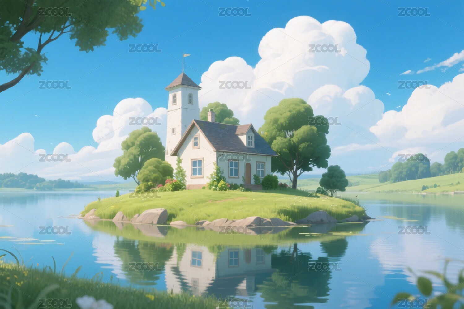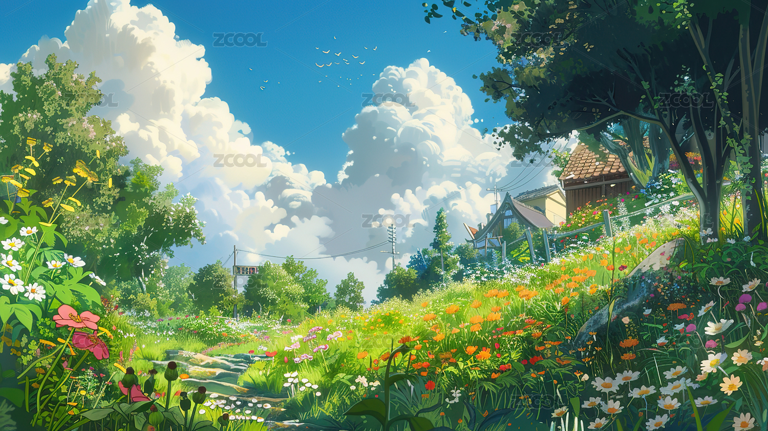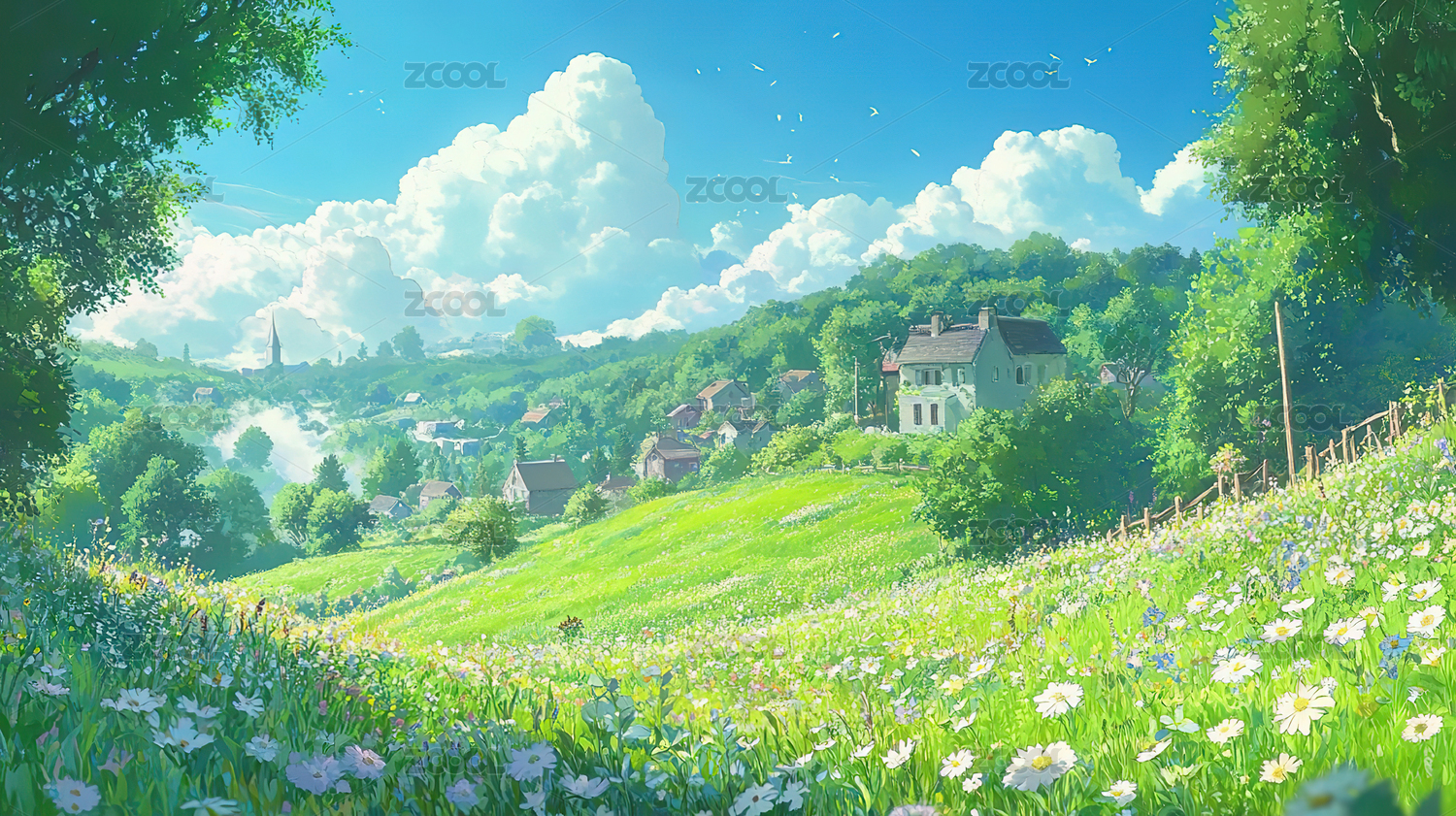 蓝天白云草地绿色大树建筑插画风景壁纸