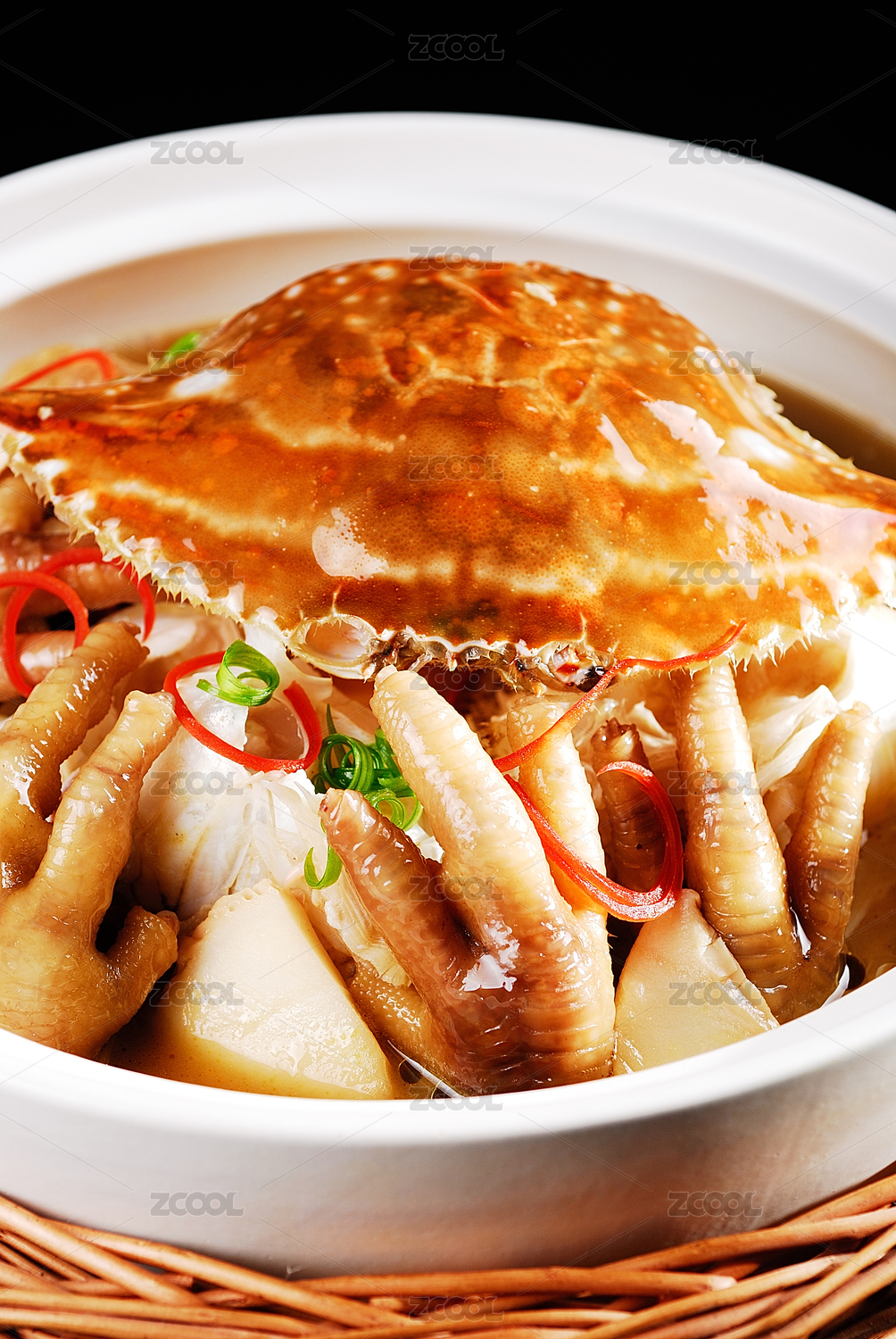 鲜蟹走地鸡鲍鱼煲,肉蟹走地鸡,小鲍鱼,鲍鱼,走地鸡,鸡翅,洋葱,蒜子,肉蟹煲,静物
