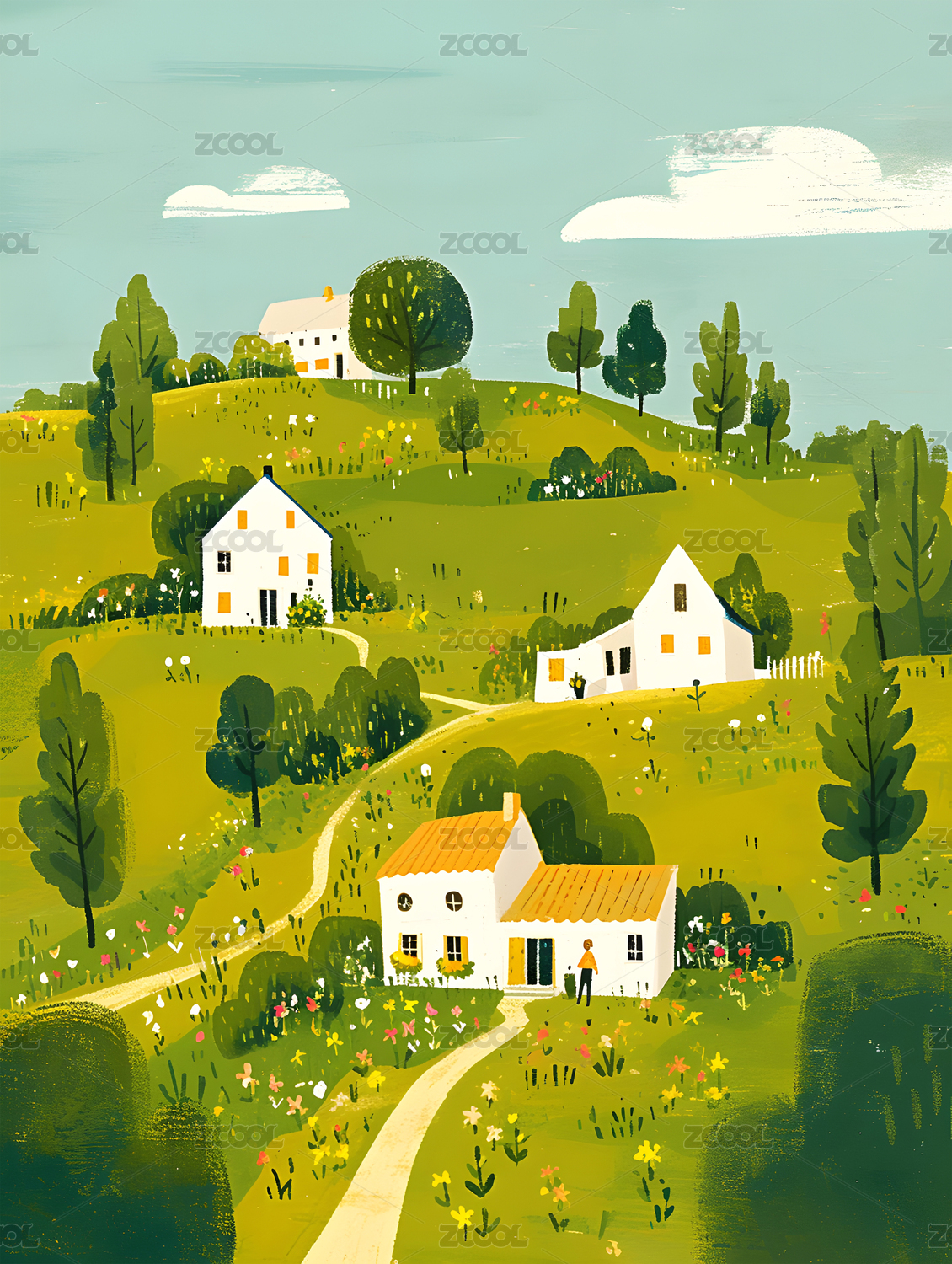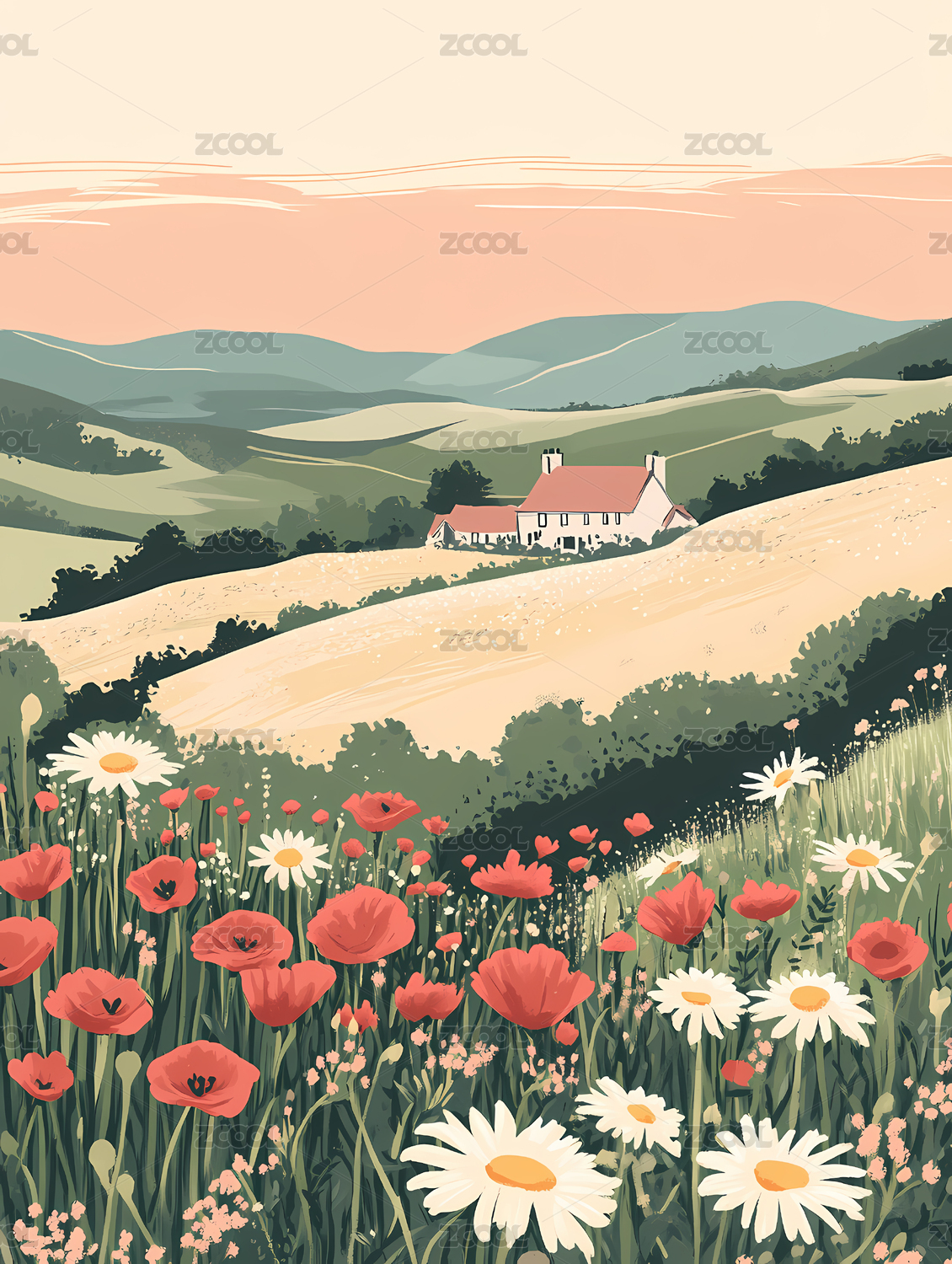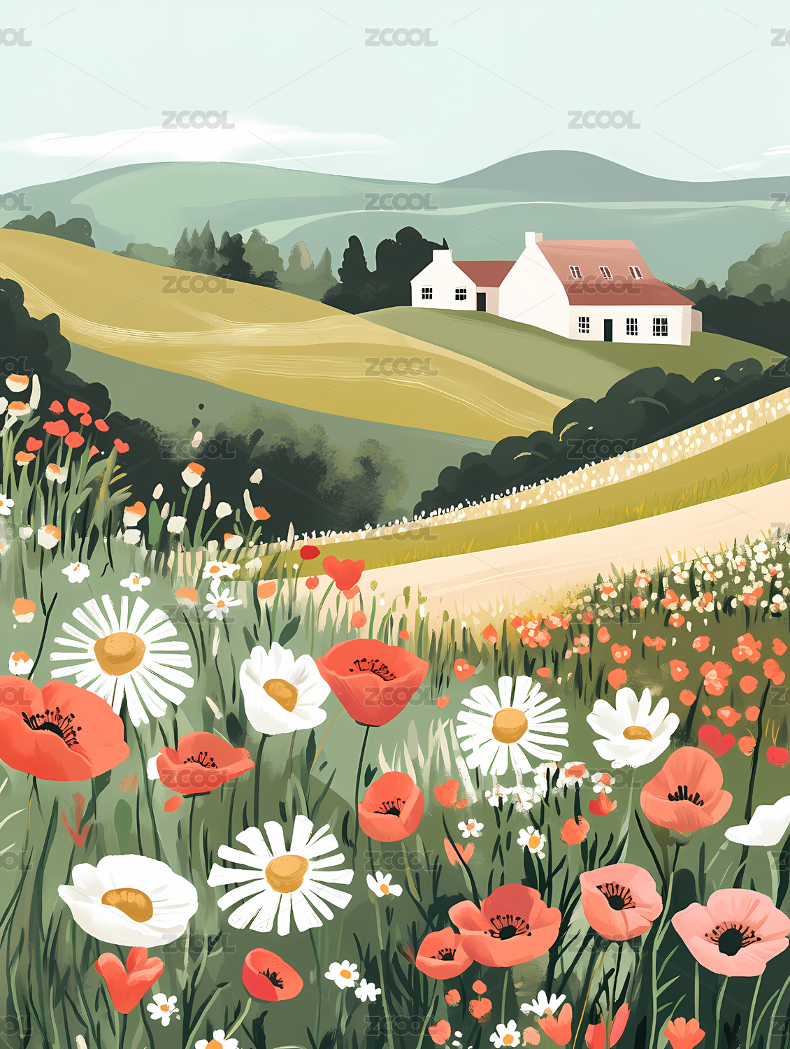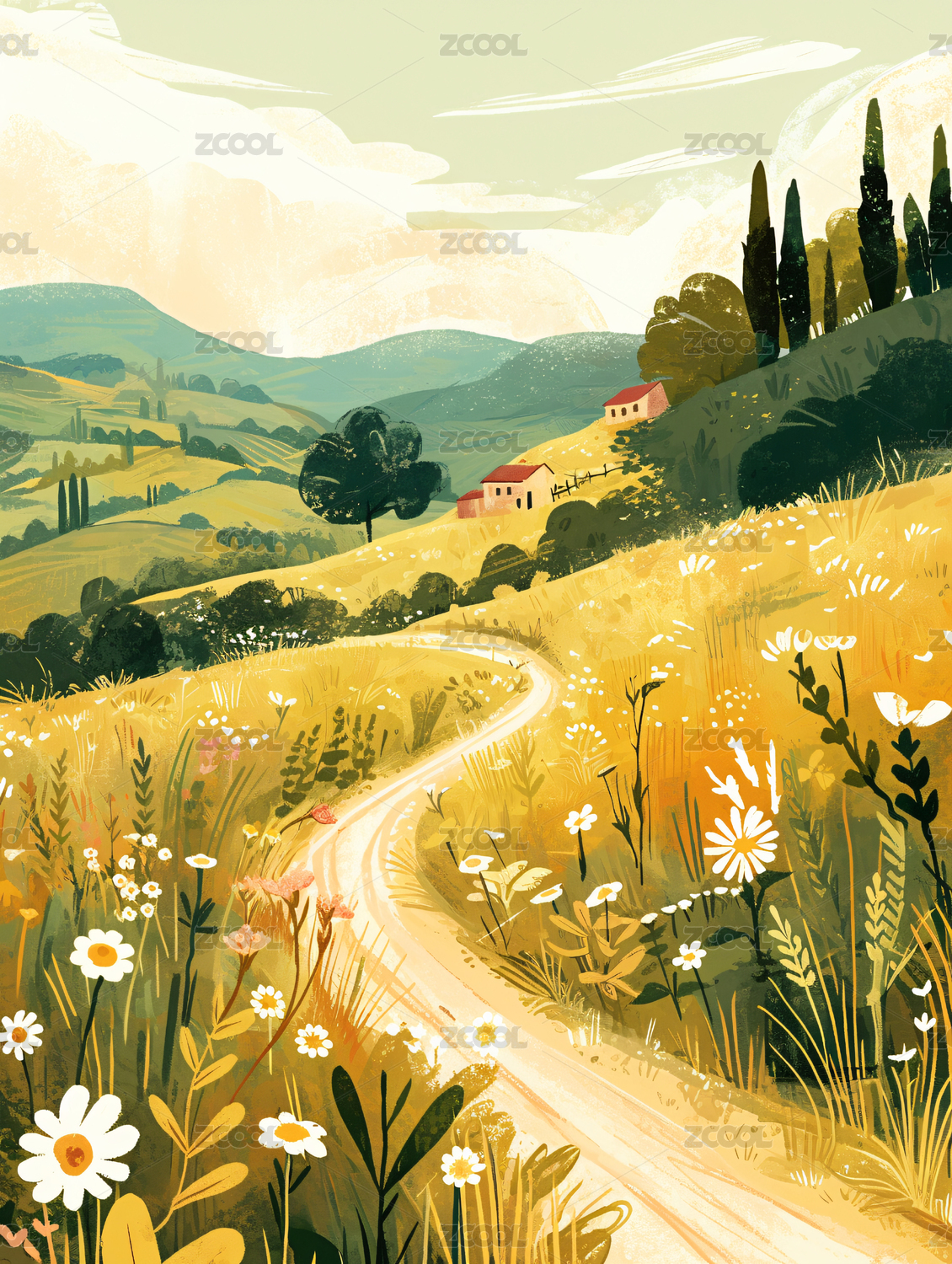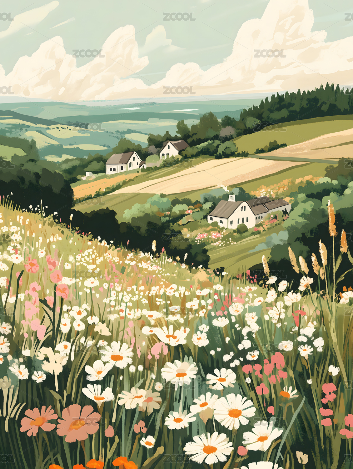 开满花朵的田园风光插画