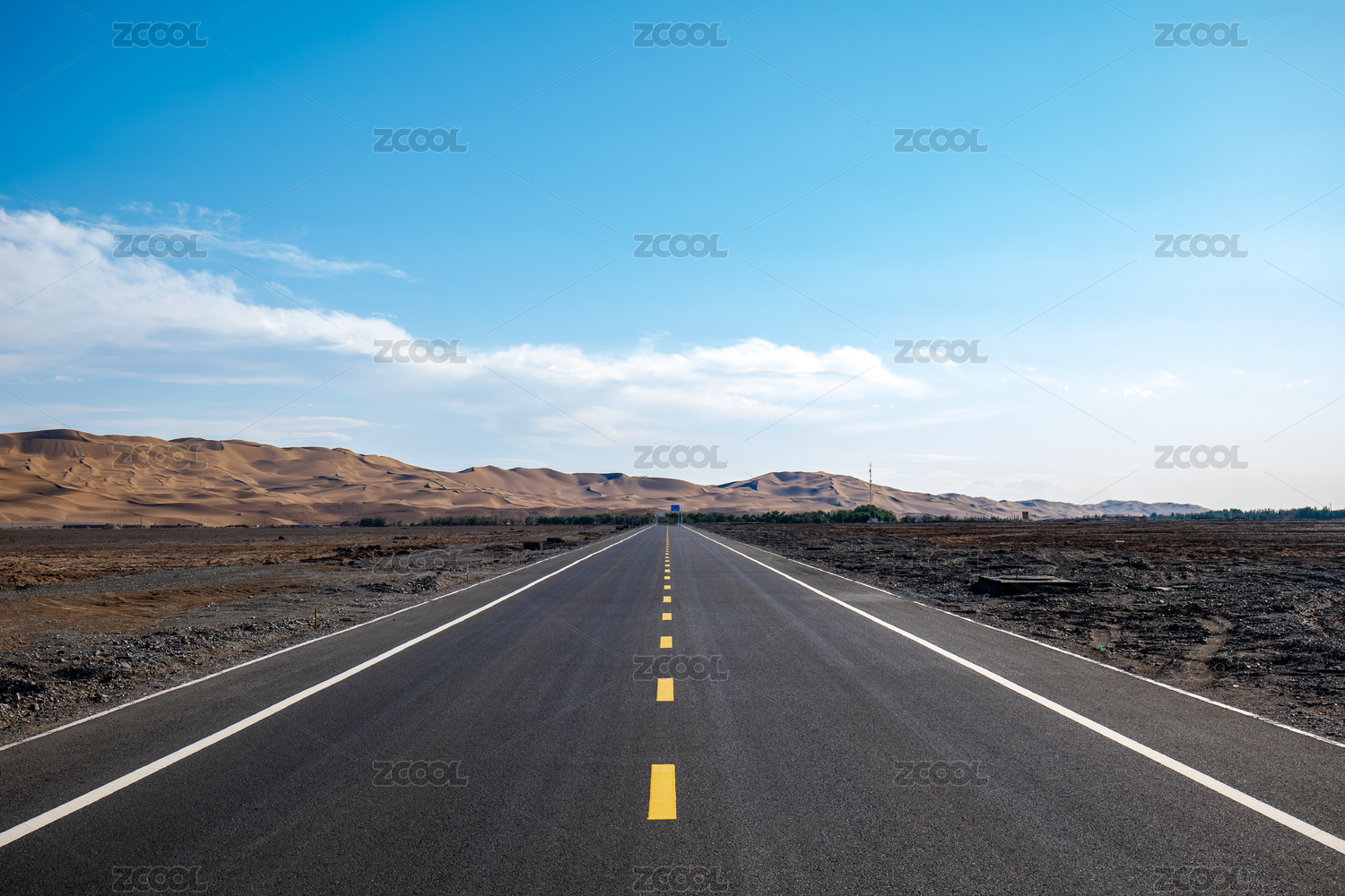 中国新疆吐鲁番库木塔格沙漠旁笔直道路
