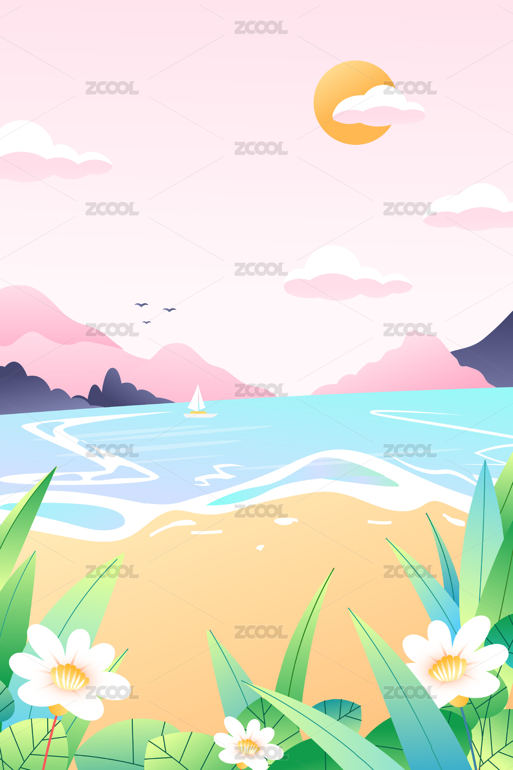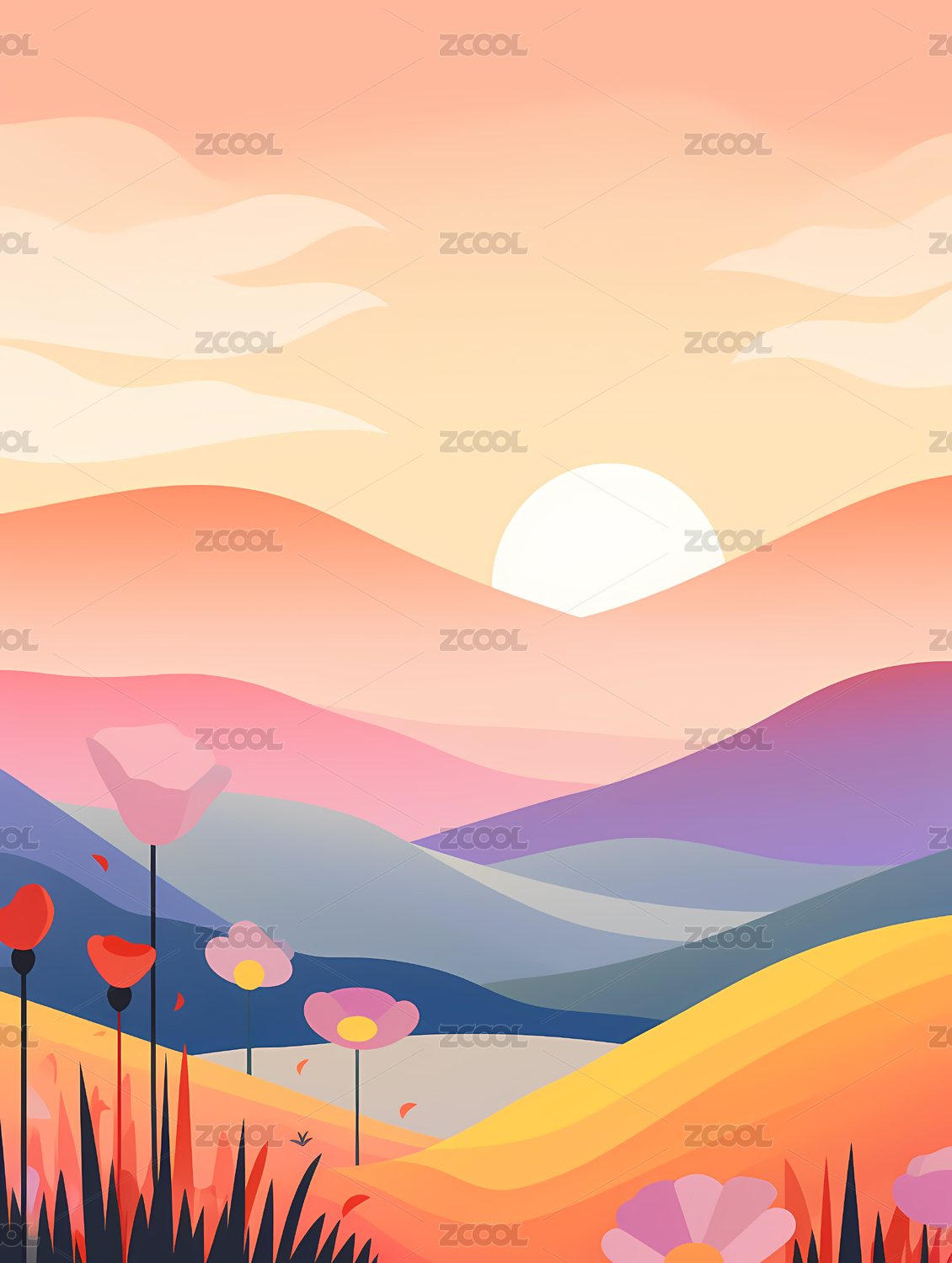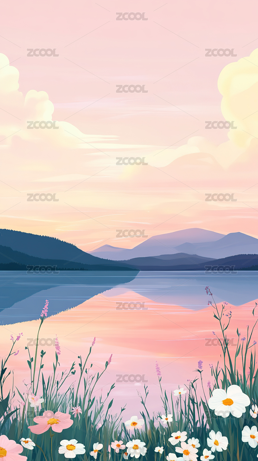 粉色花卉夕阳插画