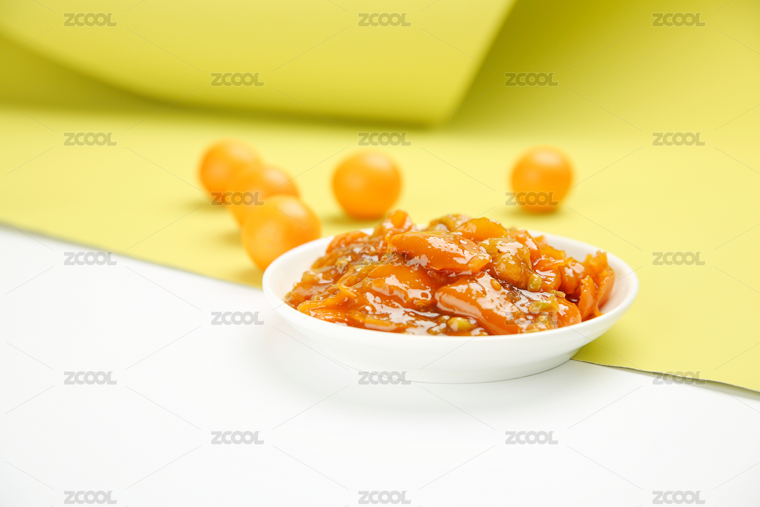 金橘酱和金桔放在黄白撞色背景上