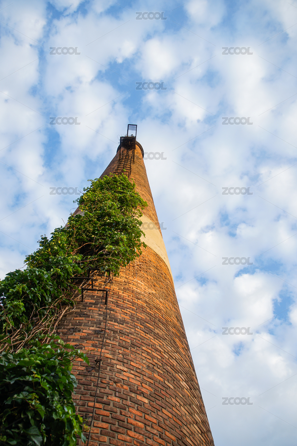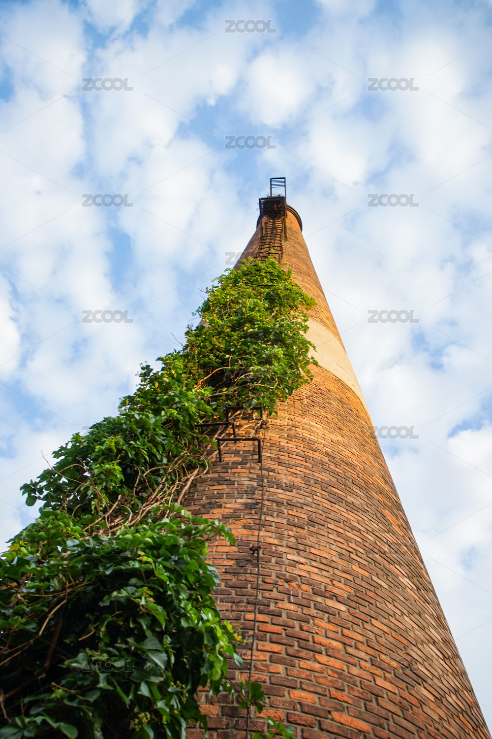 红砖烟筒上的植物爬山虎