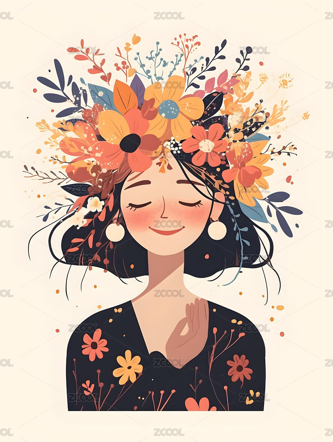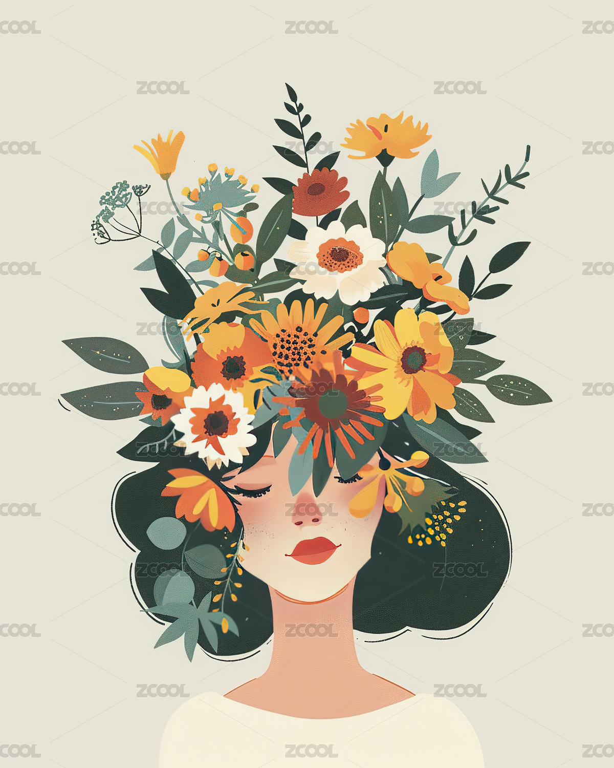 白底头戴鲜花的女孩女性人物头像插画绘画