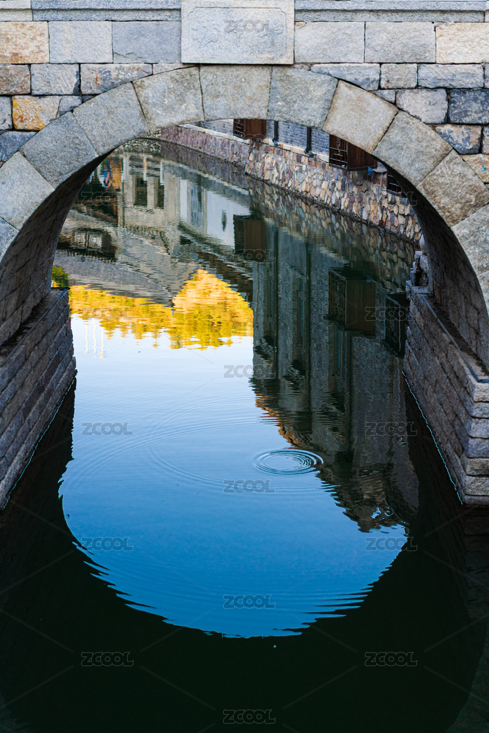 中国北京古北水镇景区桥下河水倒影