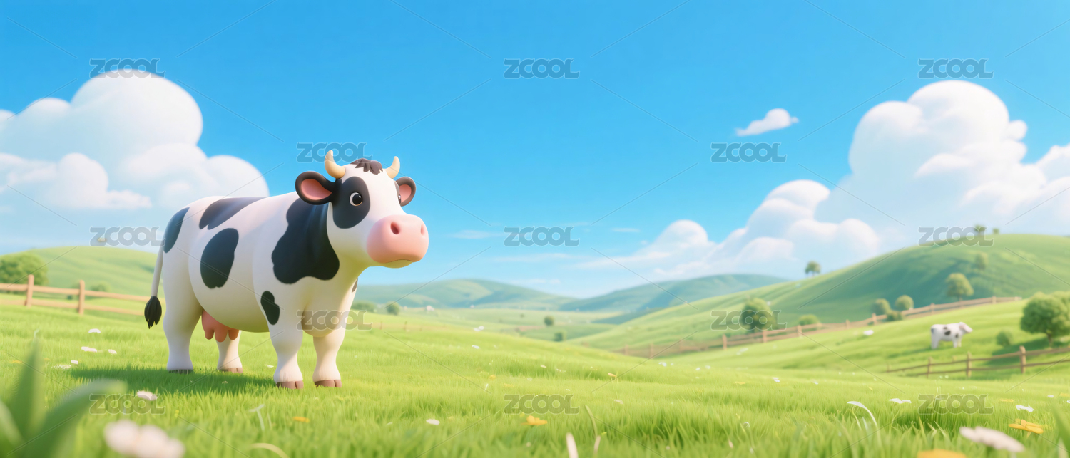 蓝天下绿色草地中一头可爱的奶牛