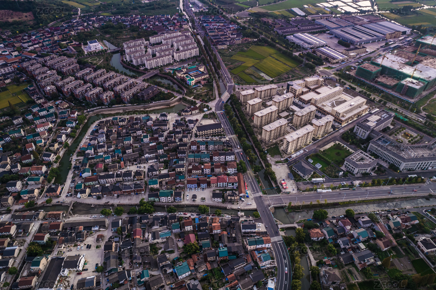 航拍,小镇,田园风光,河网,江南,水乡,地形,山峦,日暮光