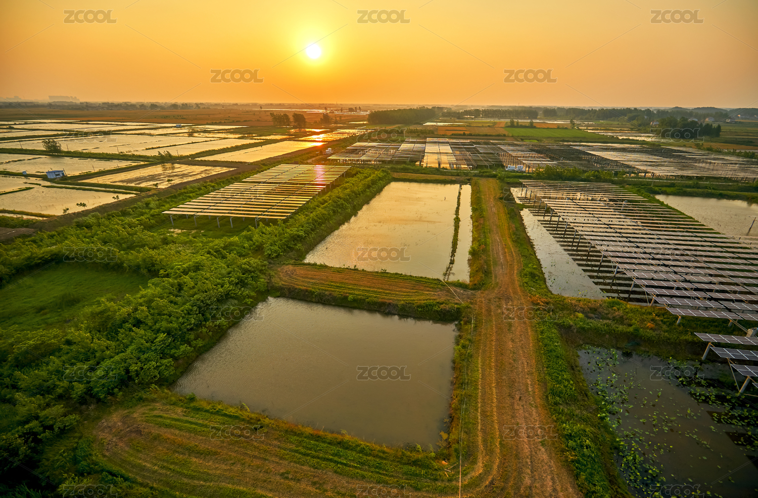 航拍日出阳光照射在户外的太阳能光伏基地