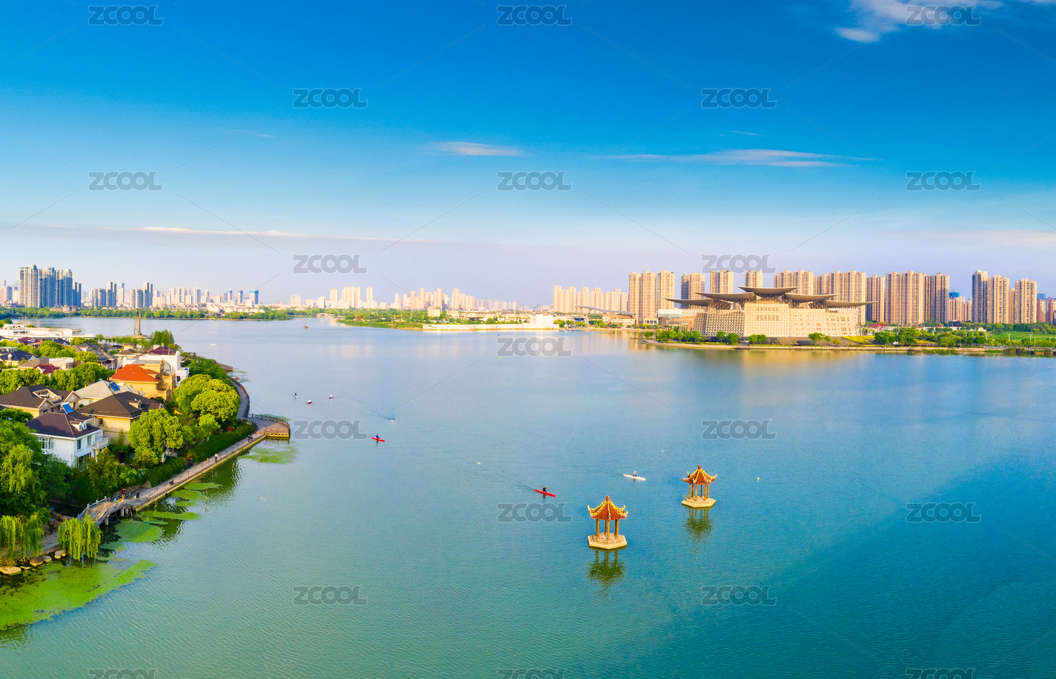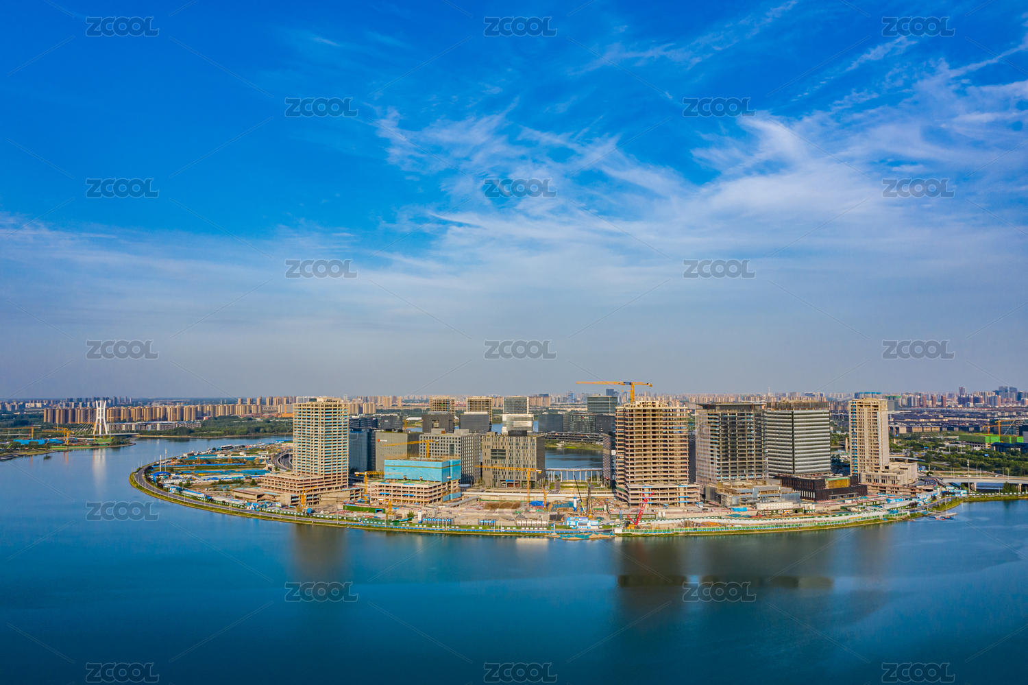 航拍郑州北龙湖金融岛商务中心环形建筑群