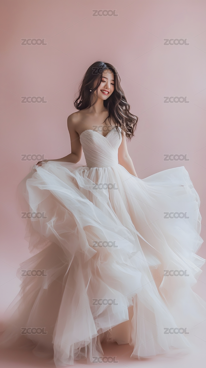 DXCZ202406,年轻女性,微笑,迷人,梦幻,幸福,柔和灯光,浪漫,精致婚纱,浅粉背景