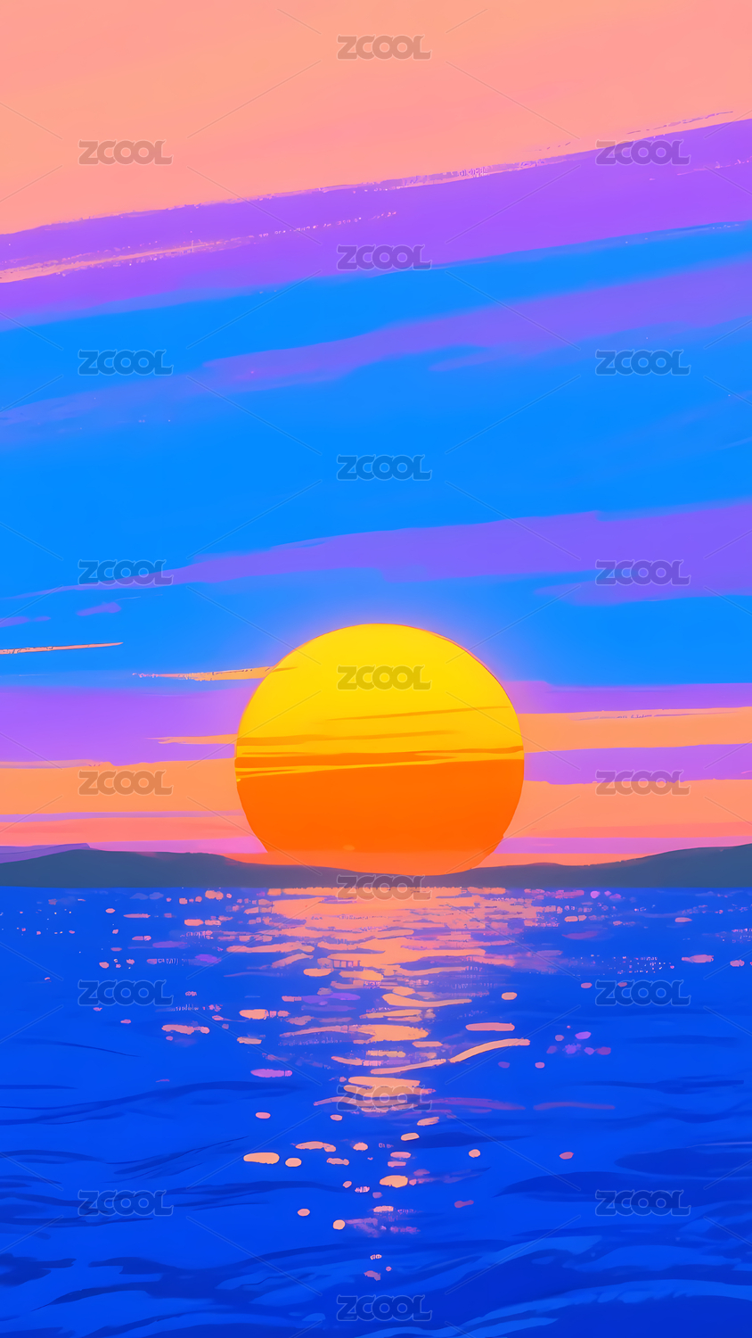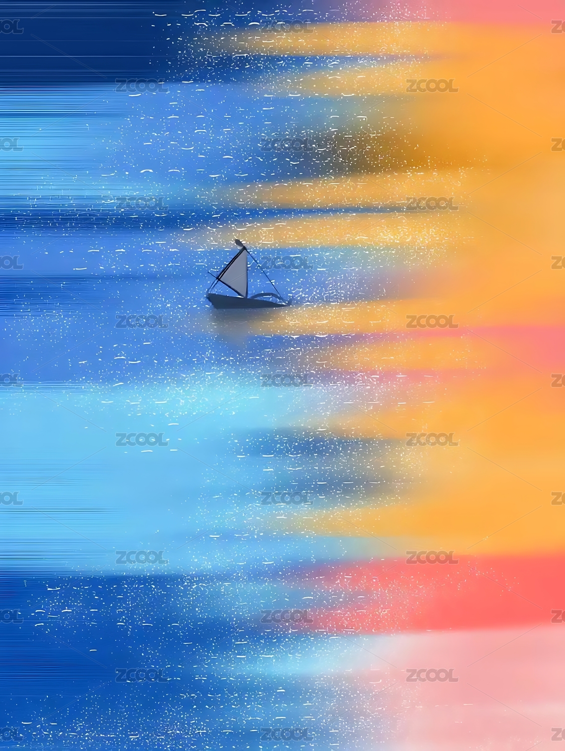 一艘行驶在朦胧海面的帆船炫彩色块艺术插画