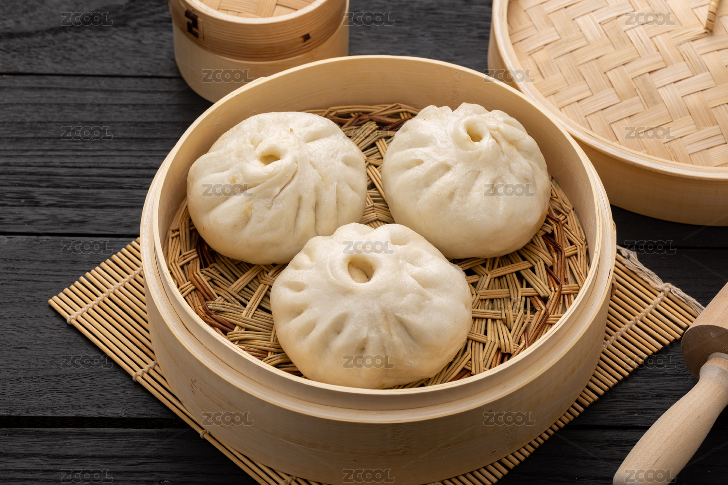 蒸笼里盛放着包子摆放在黑色背景上旁边摆放醋碟筷子