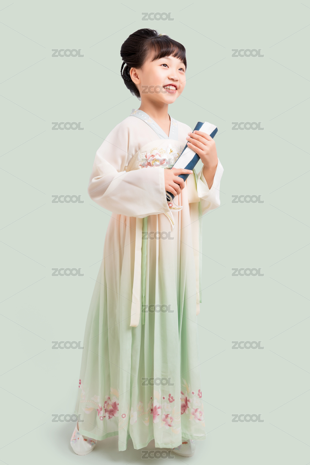 身穿中国古典唐装手拿古书的小女孩棚拍肖像