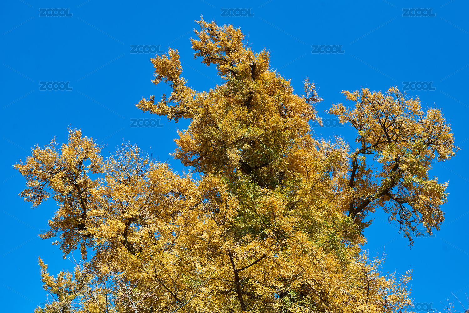 蓝天下秋天森林里金黄色树木树叶的自然风景
