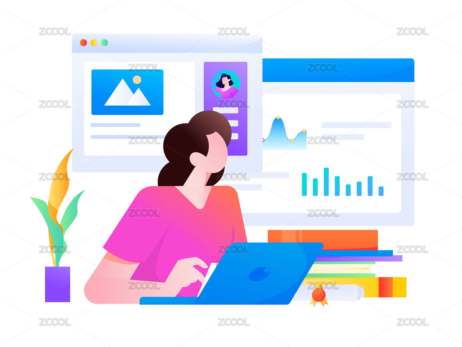 扁平风穿着黄色衣服女生在笔记本上上网冲浪