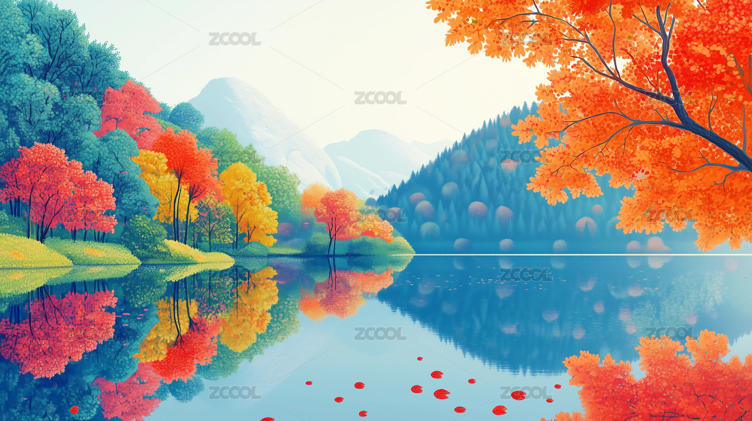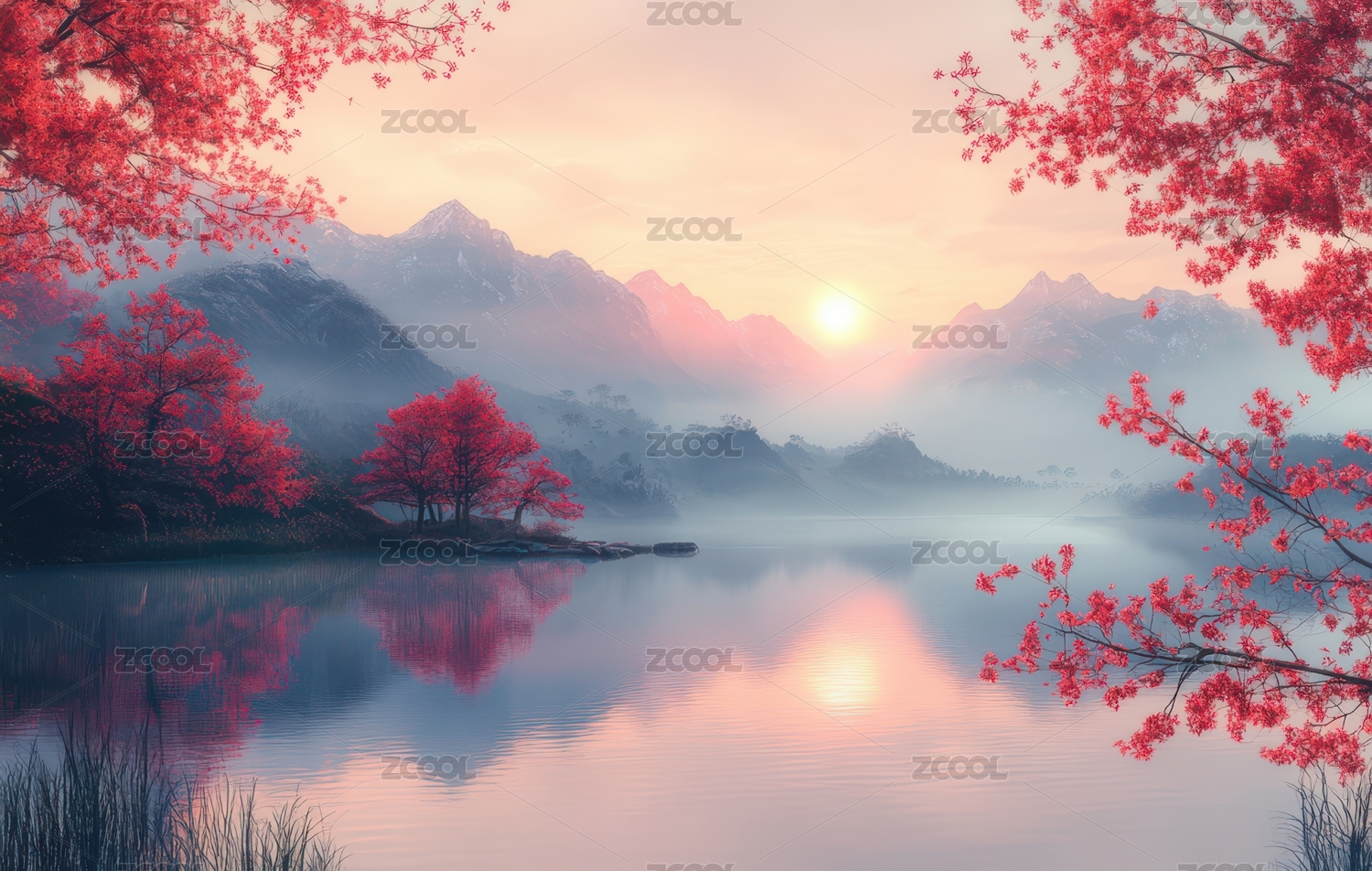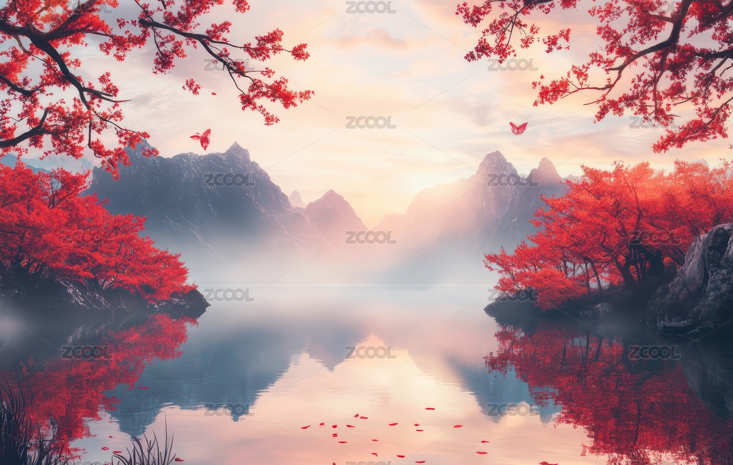 反射,宁静的湖泊,日落,五颜六色的树木,山,自然,景观,宁静,平静,水