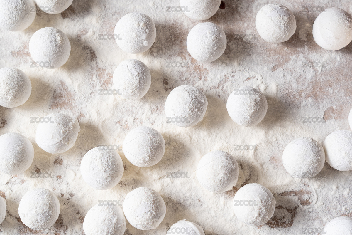 俯拍木板背景下的未煮熟的汤圆和花生原材料