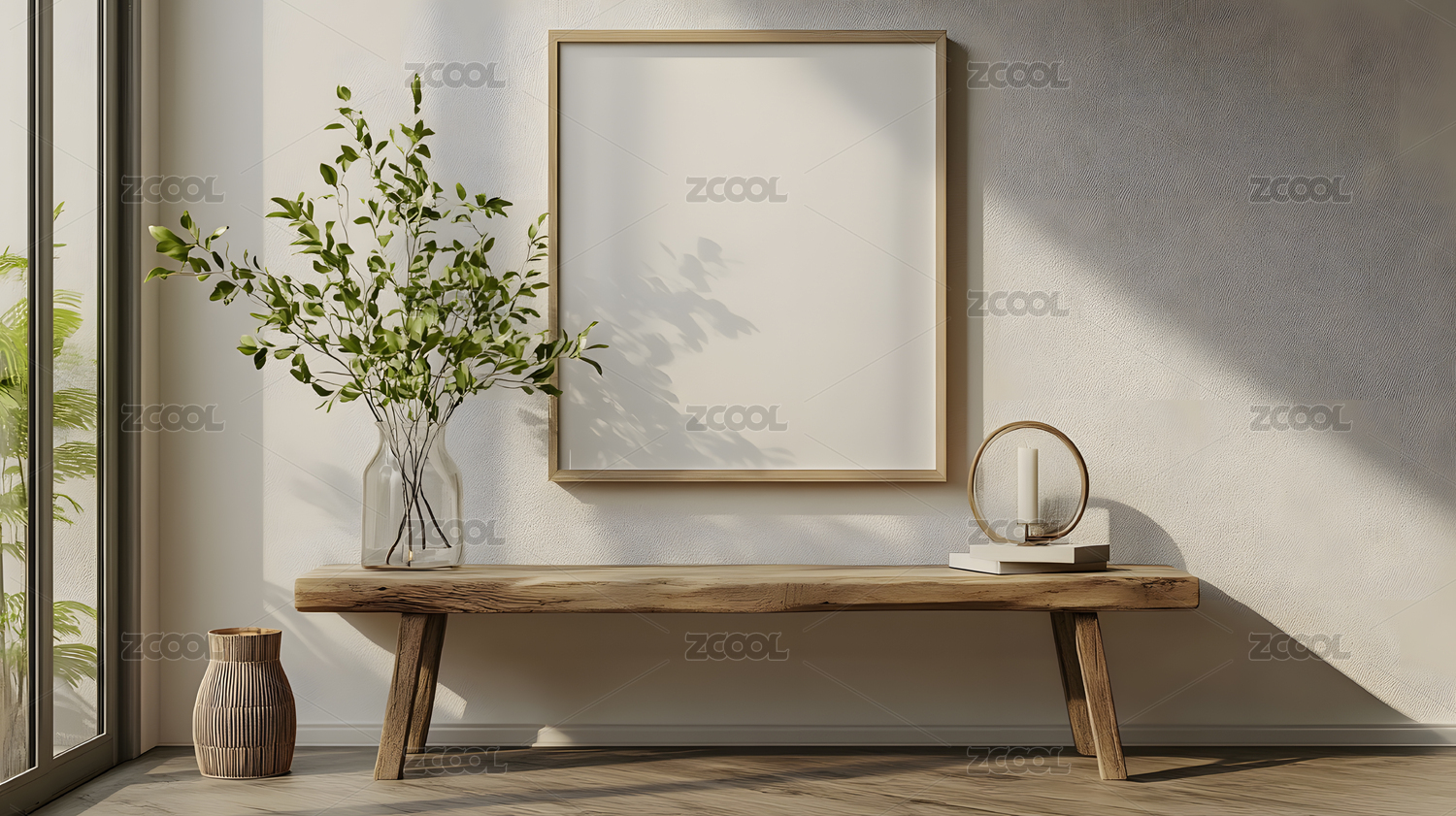 带有空框架和室内植物的极简室内设计