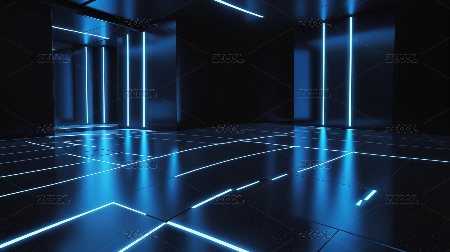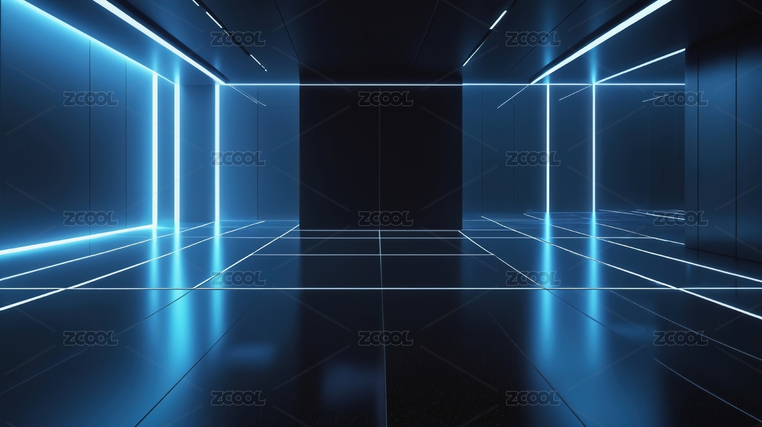 蓝色霓虹灯照亮的未来科技走廊