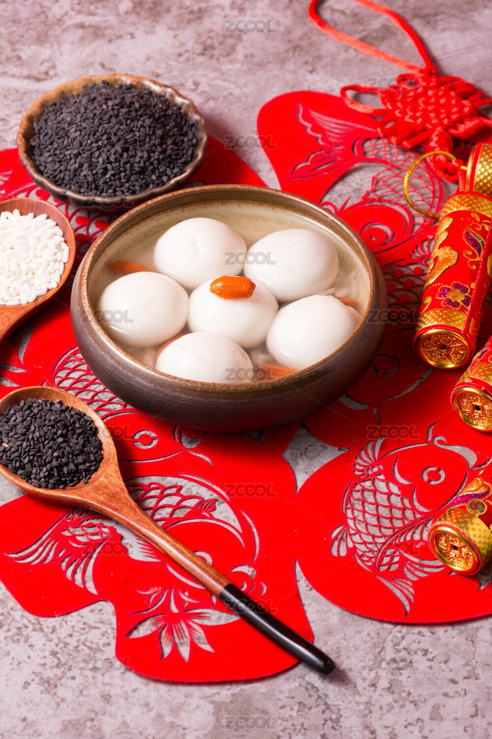 用碗装着的米酒汤圆放在剪纸上