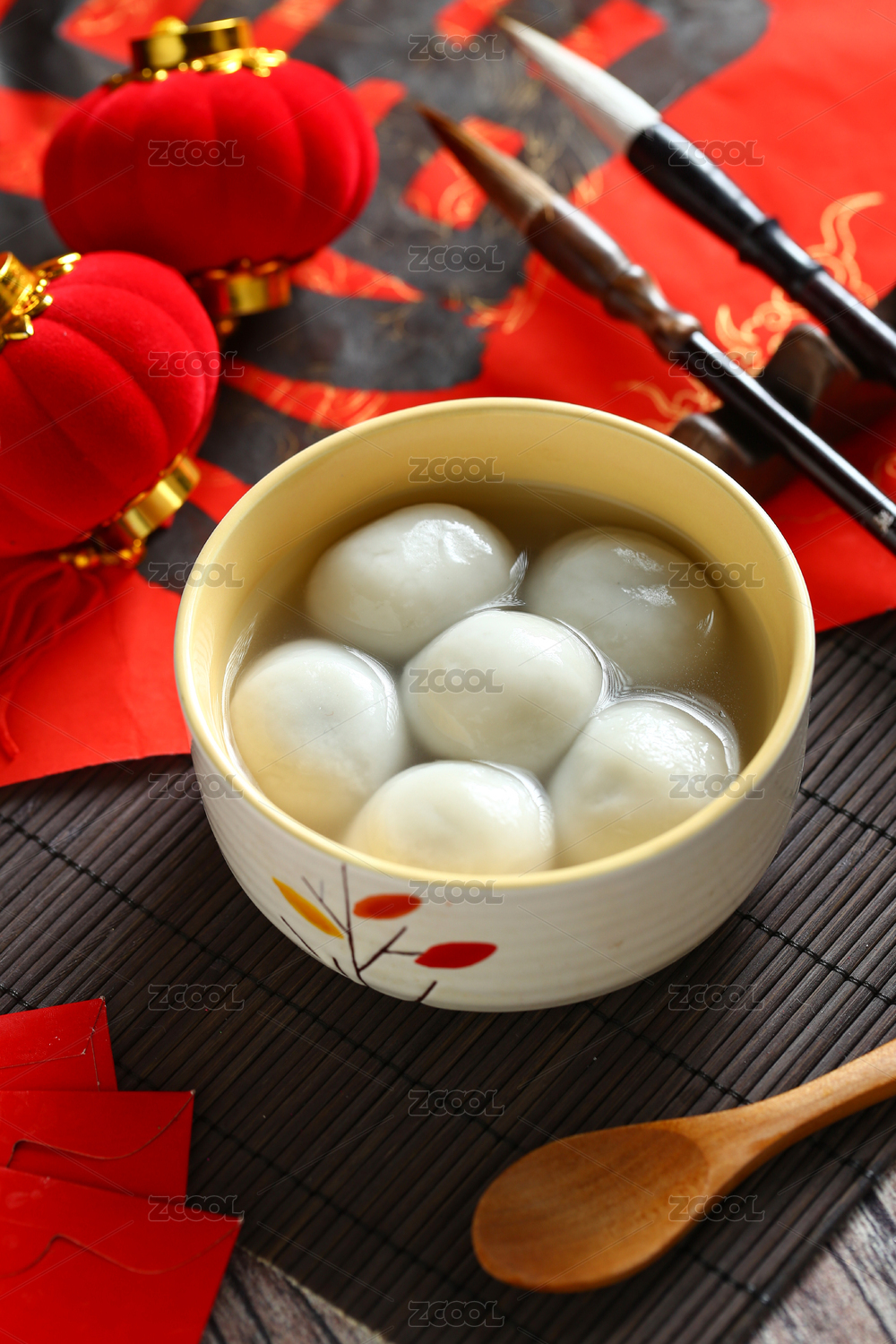 煮熟的元宵节汤圆在毛笔手写春联背景上