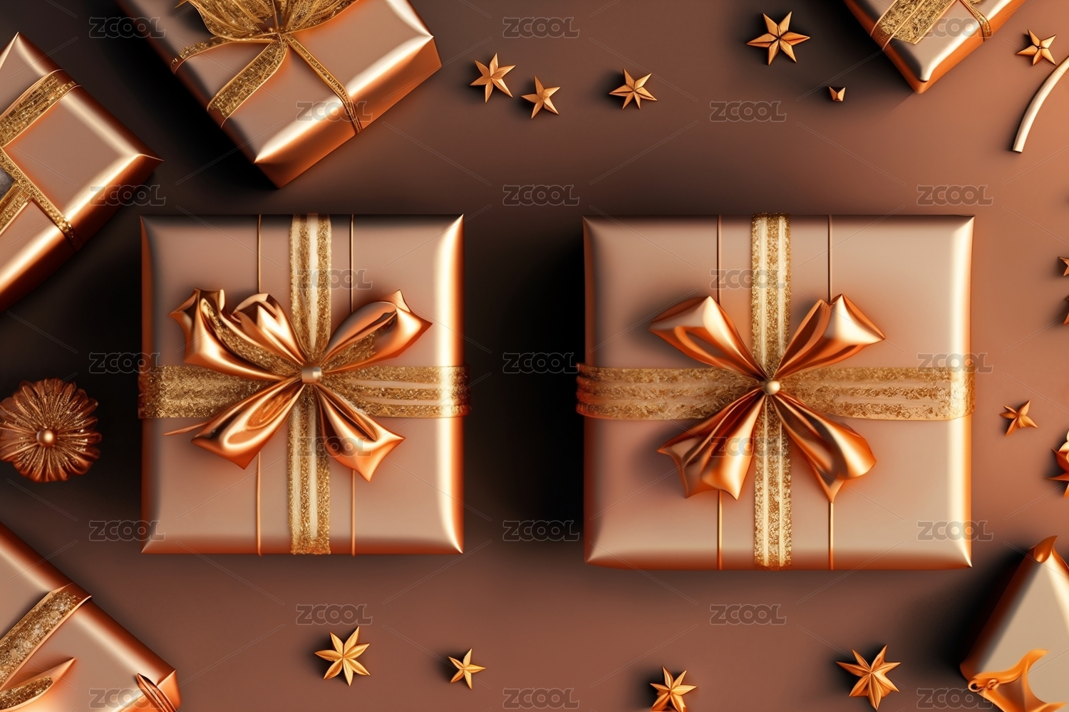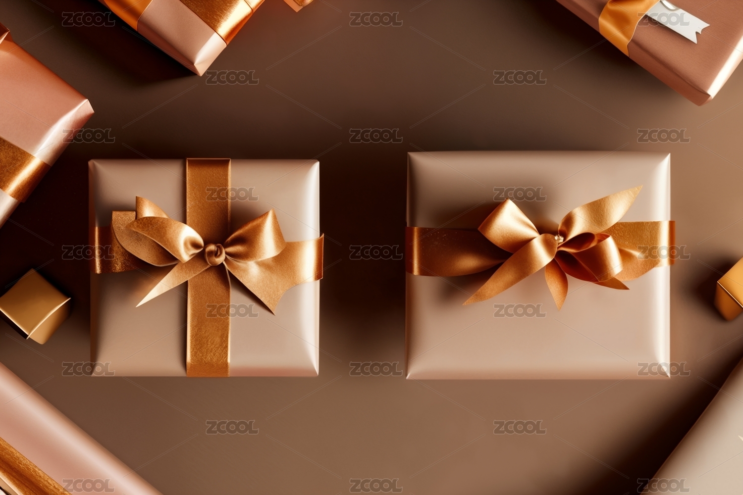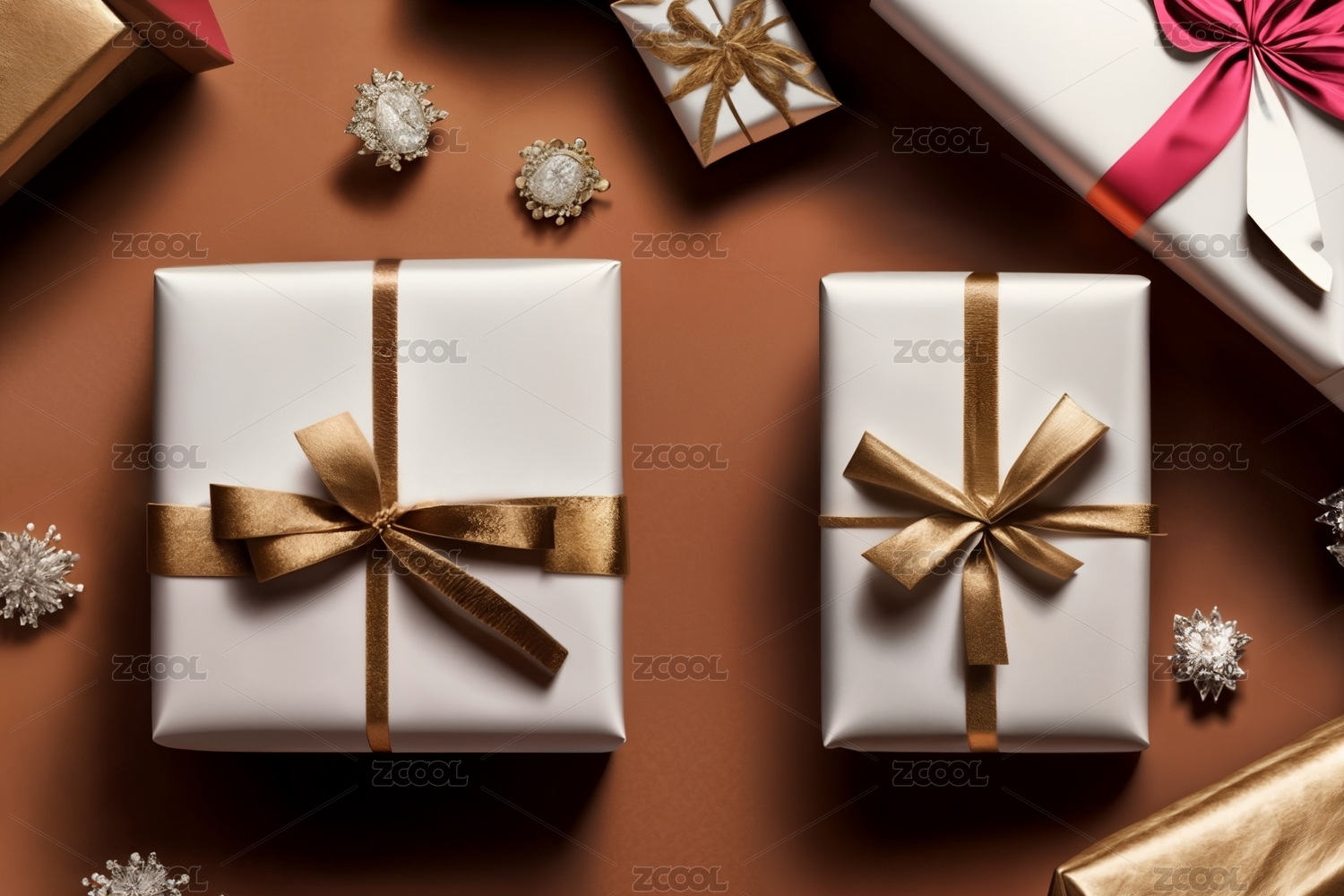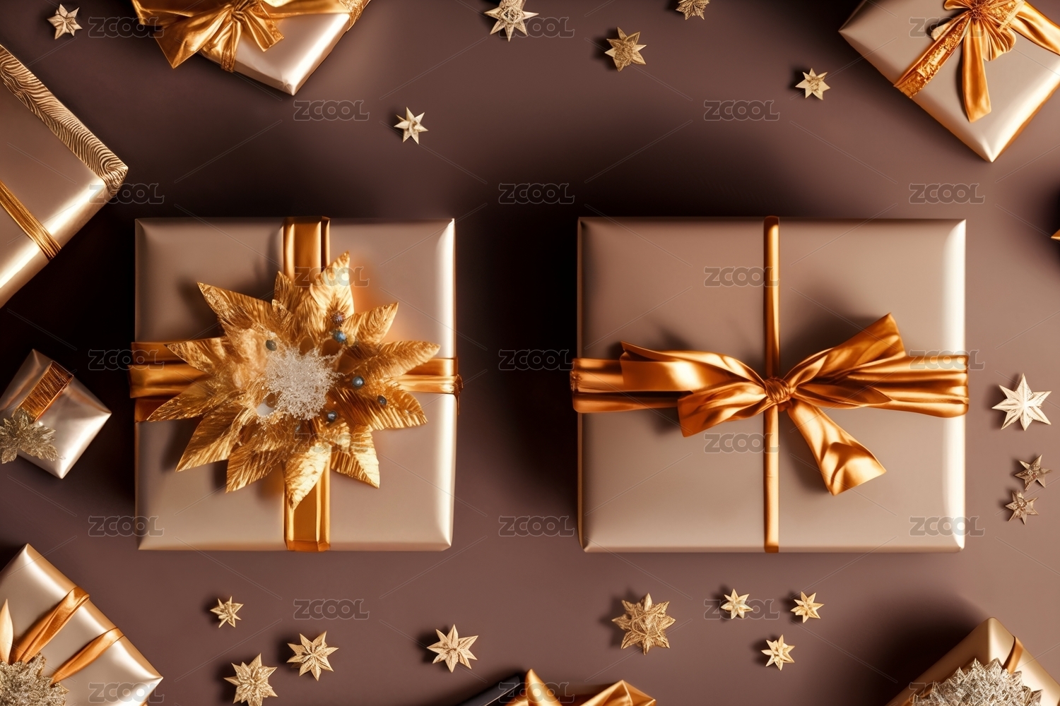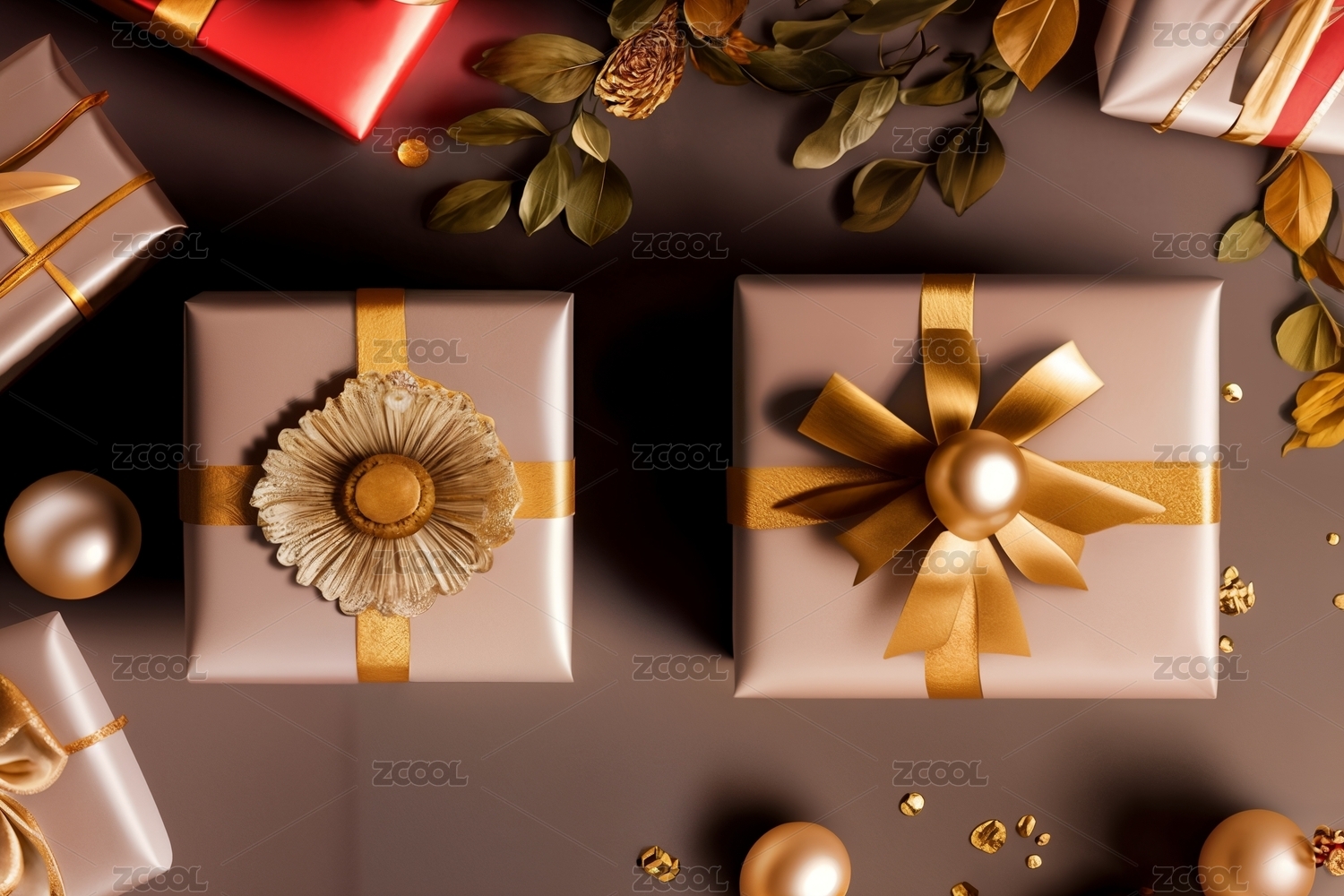 正上方棕色背景的圣诞礼物照片