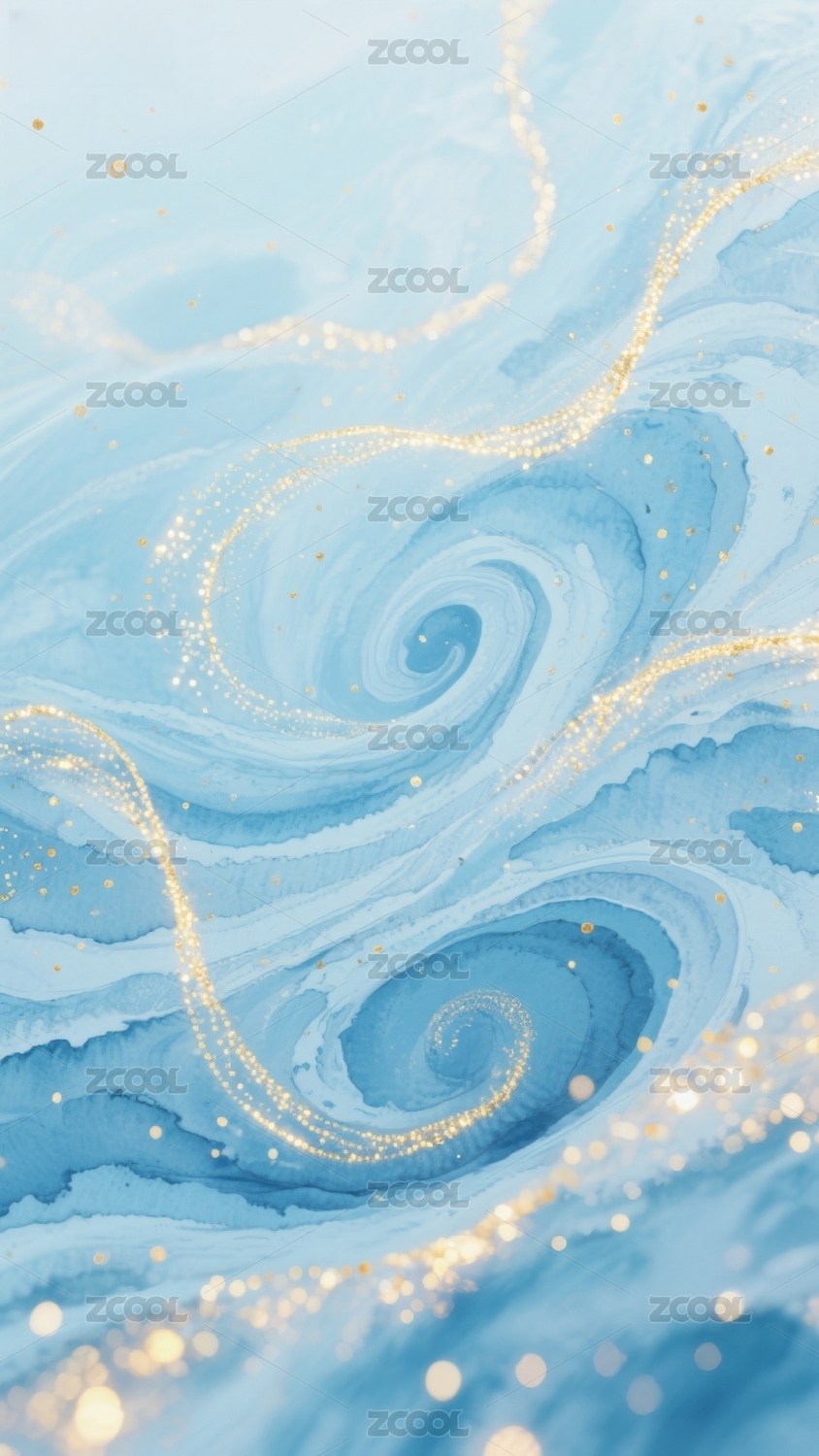 蓝色漩涡与金色光点的抽象图案