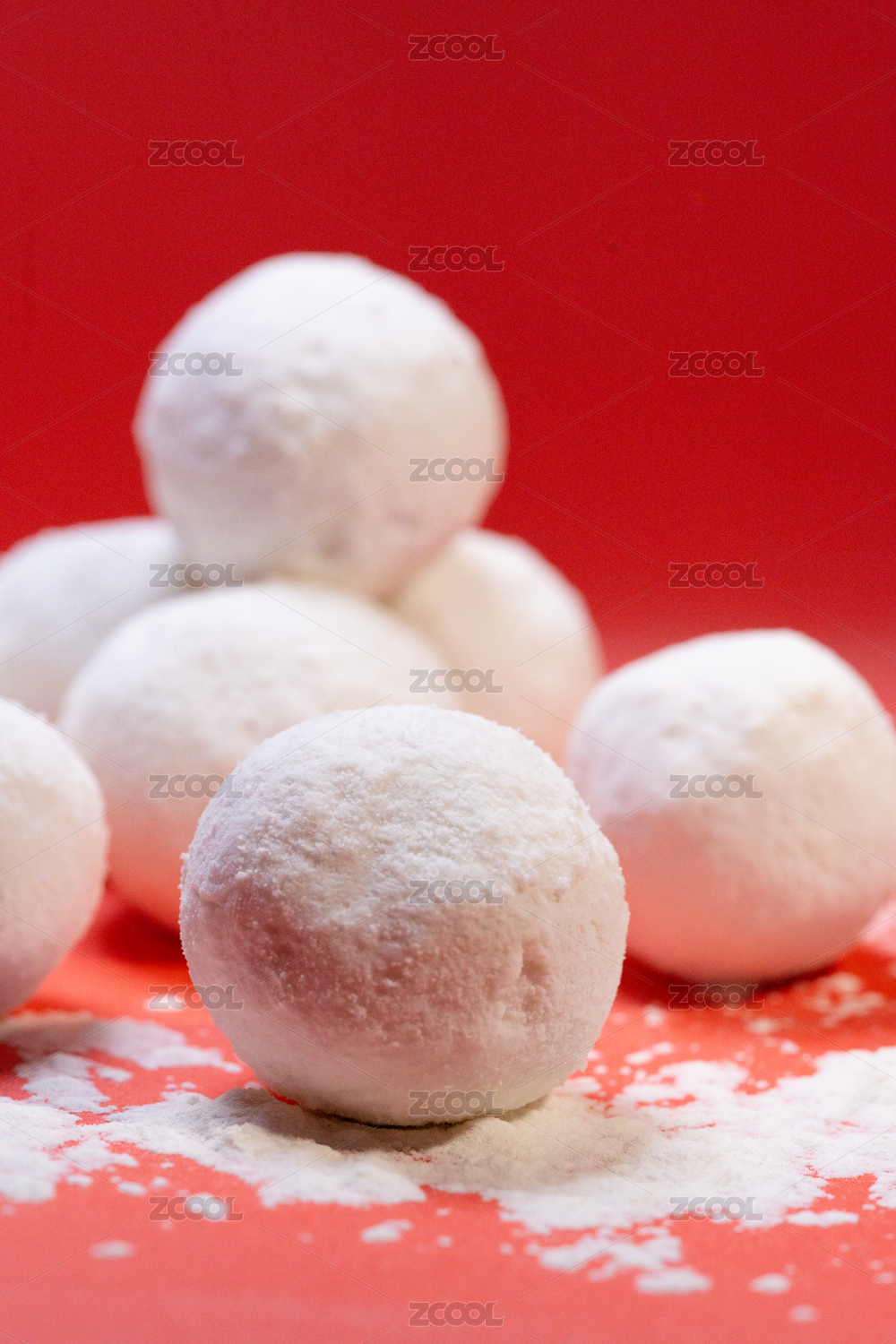 红色背景面粉上散落着元宵芝麻汤圆