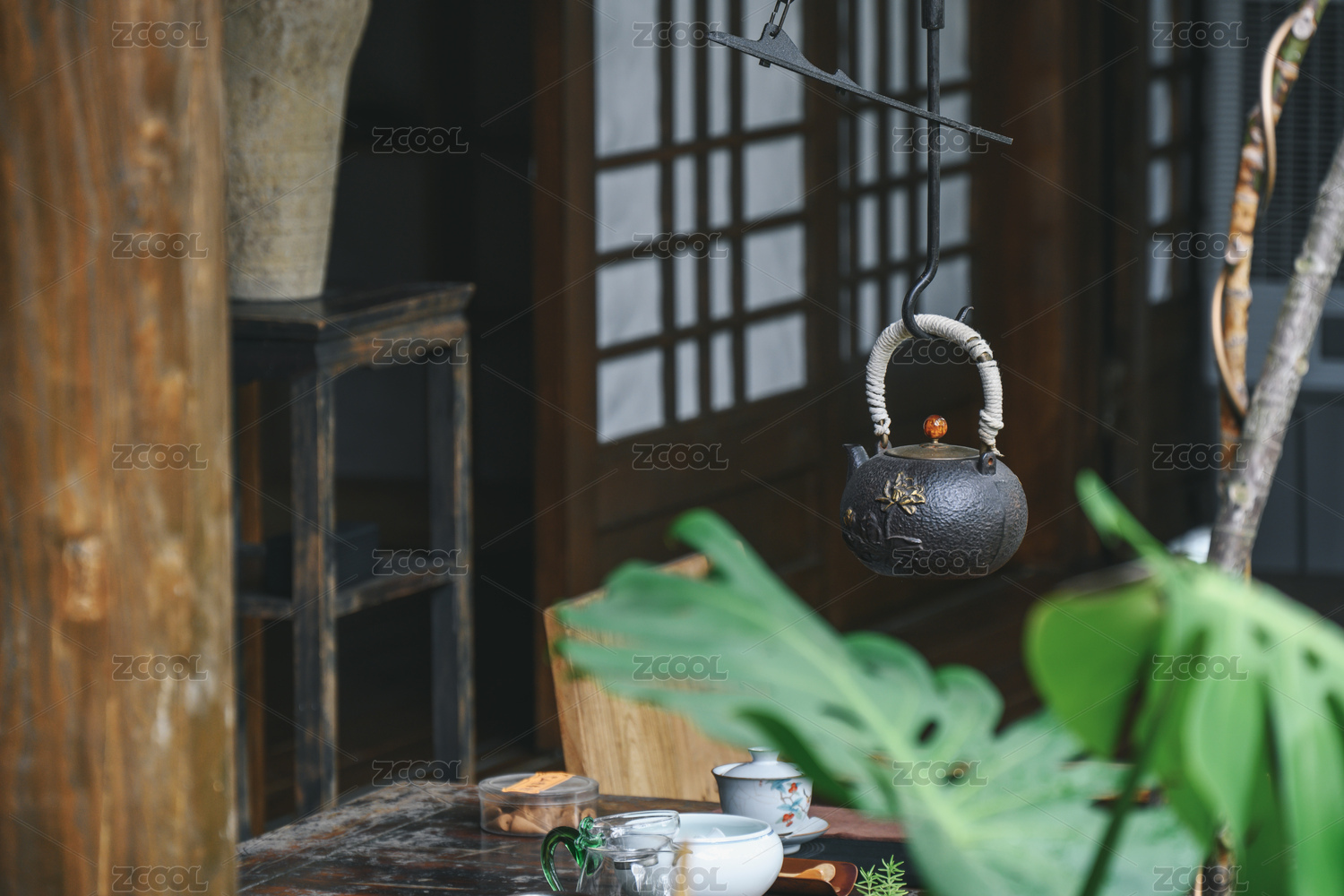 木桌上的茶壶茶杯茶具