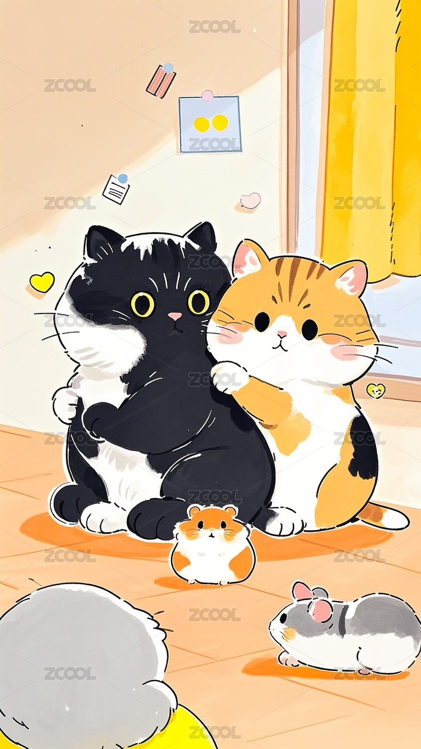 猫咪,仓鼠,卡通,可爱,温暖,治愈,手绘,插画,黑白猫,橘猫