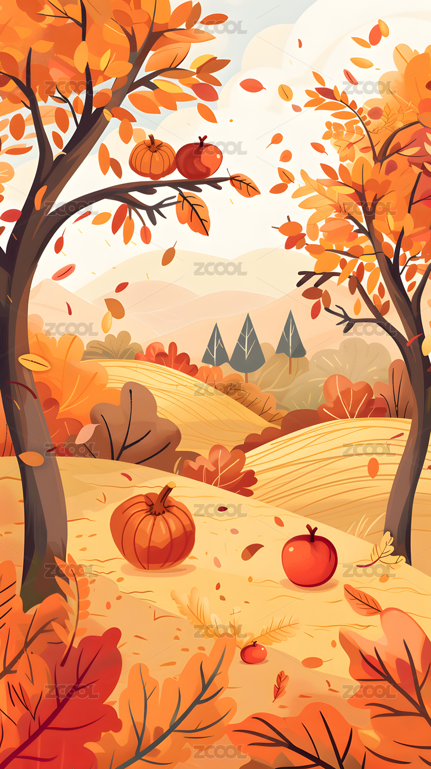 小熊,秋天,柿子,树叶,山,田野,小推车,可爱,卡通,插画
