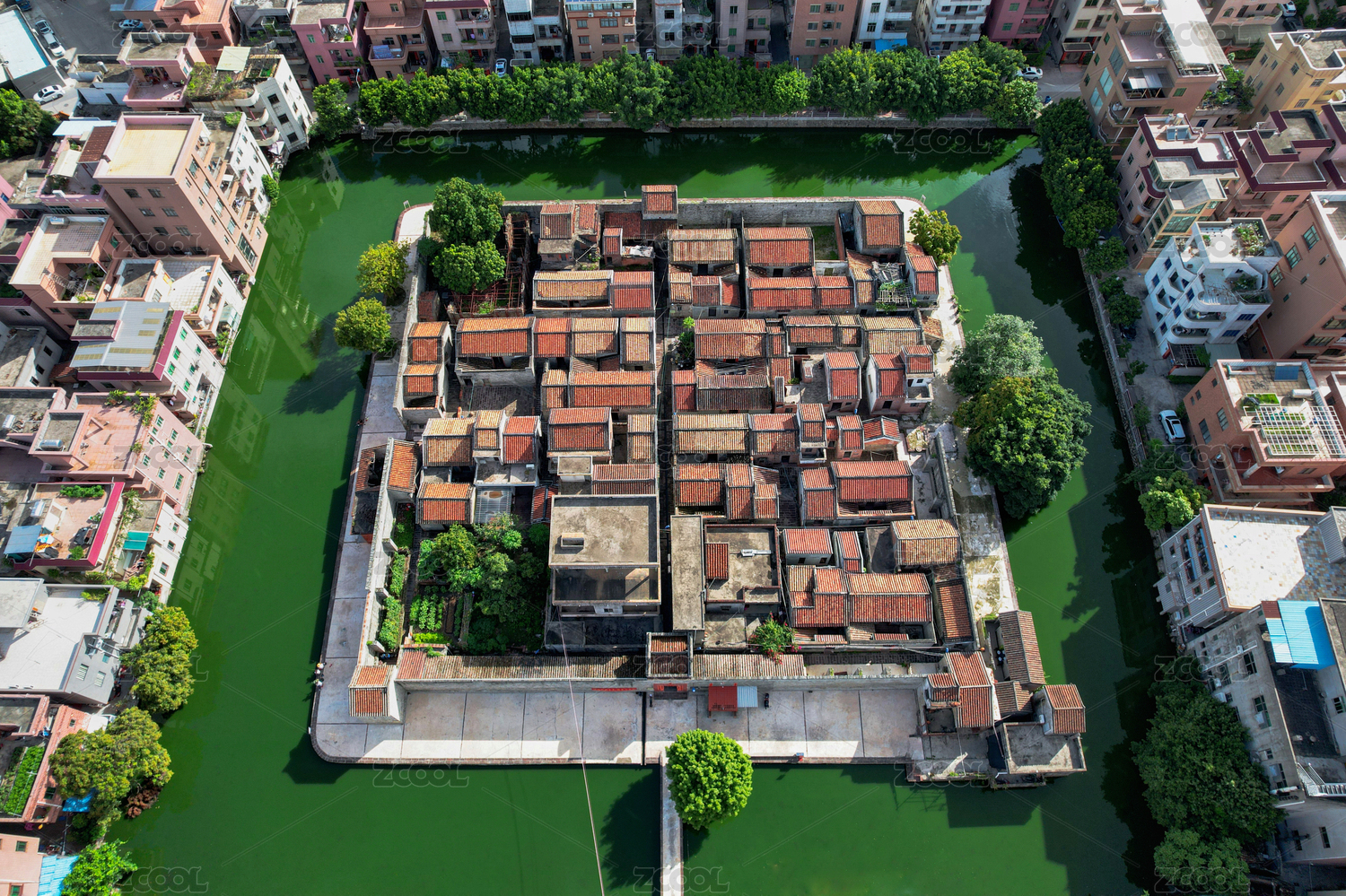 中国广东东莞虎门古建筑逆水流龟村堡航拍景观