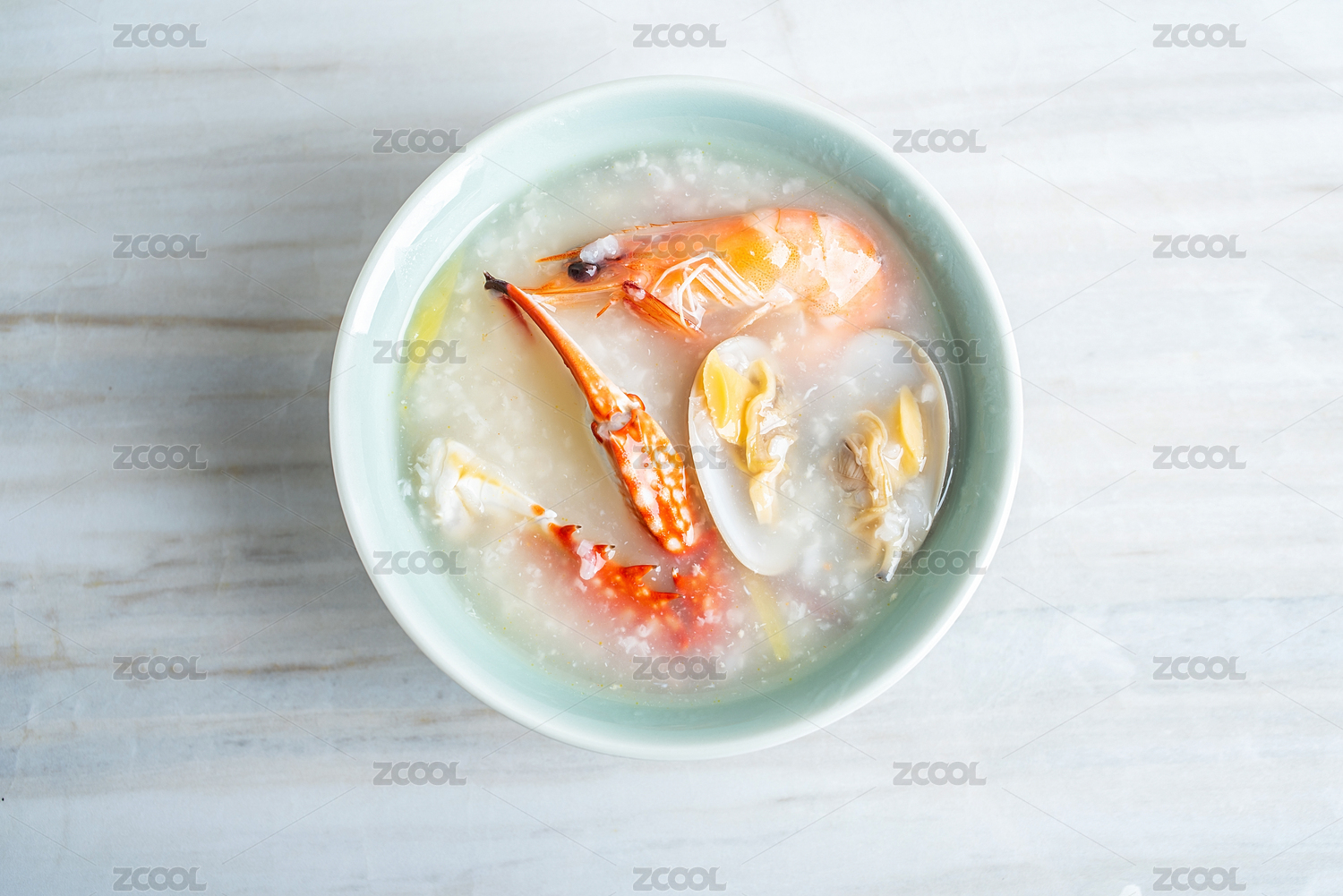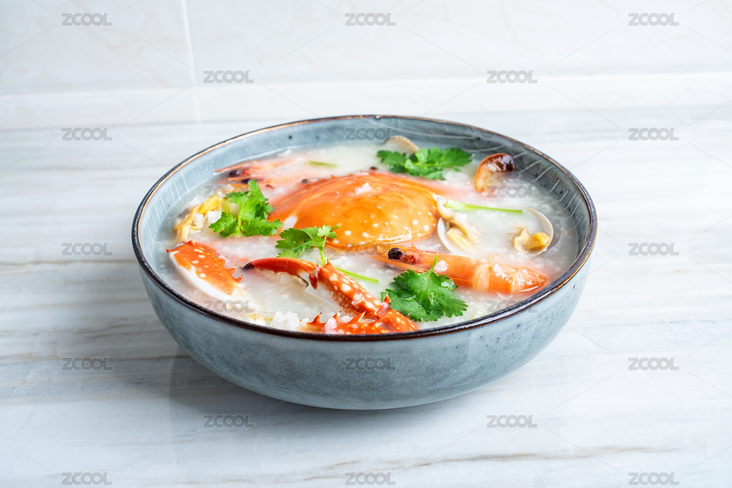 中国美食厨房台面上一碗虾蟹海鲜粥