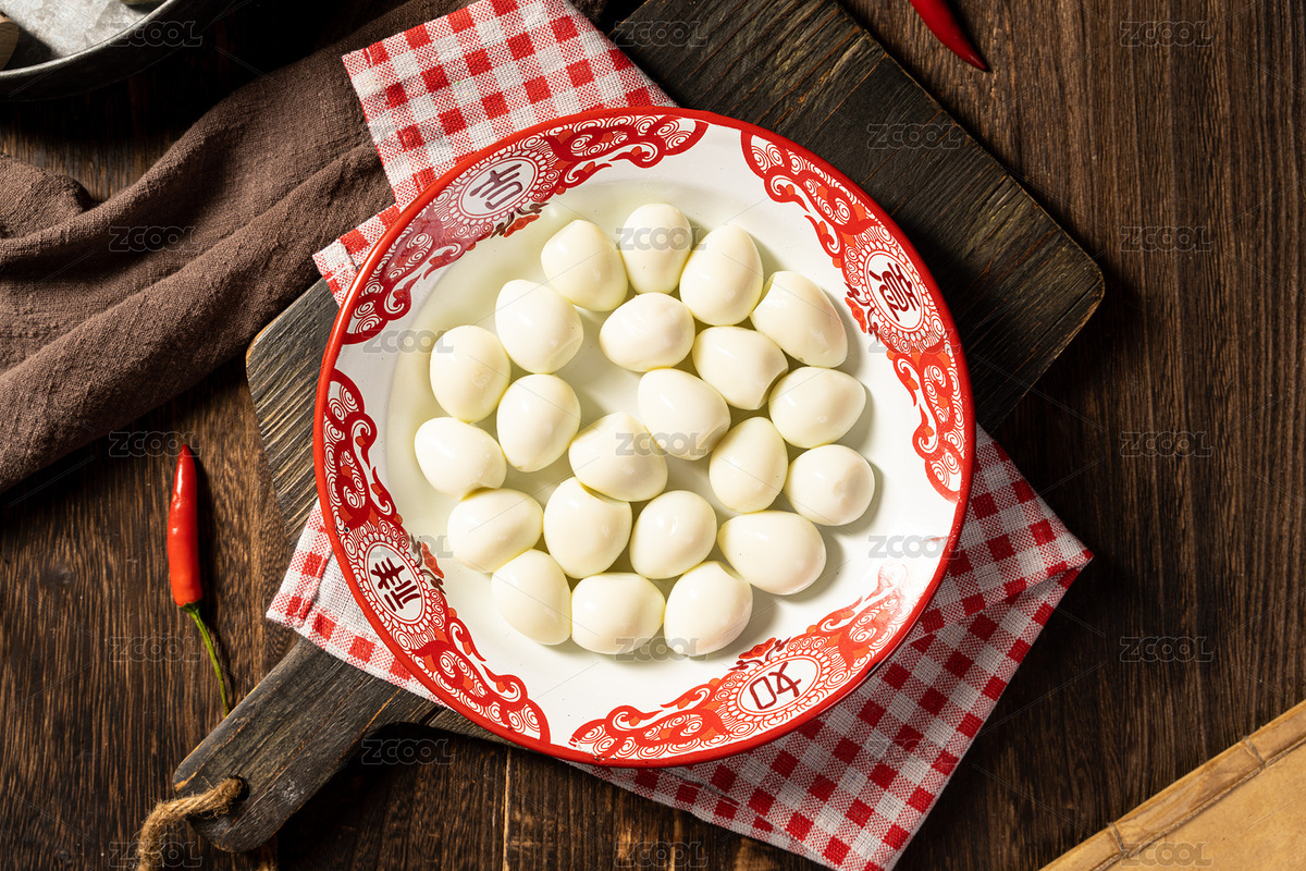 桌面上的盘子里的美味可口的水煮鹌鹑蛋
