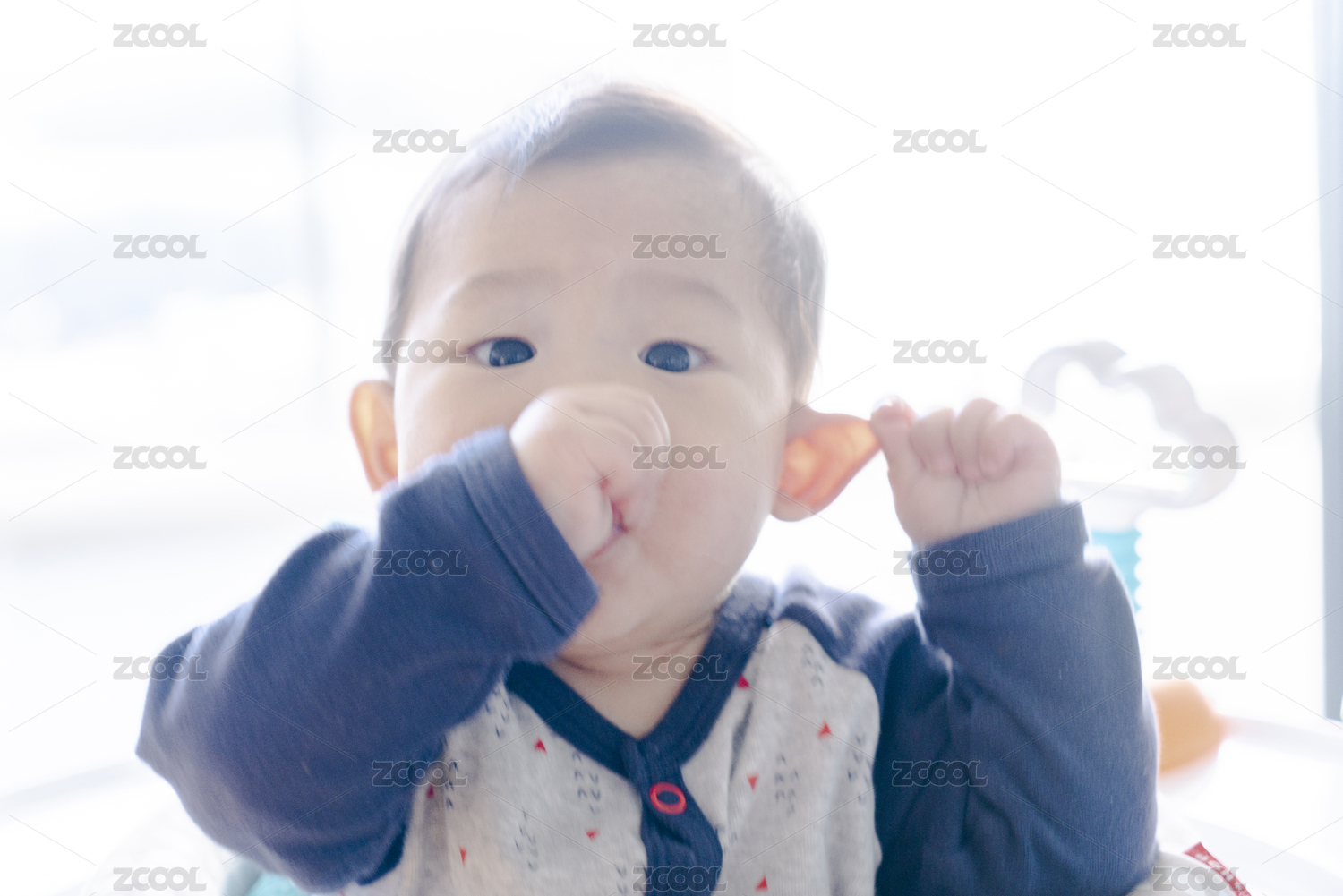 兴奋地吮手指扯耳朵的婴儿