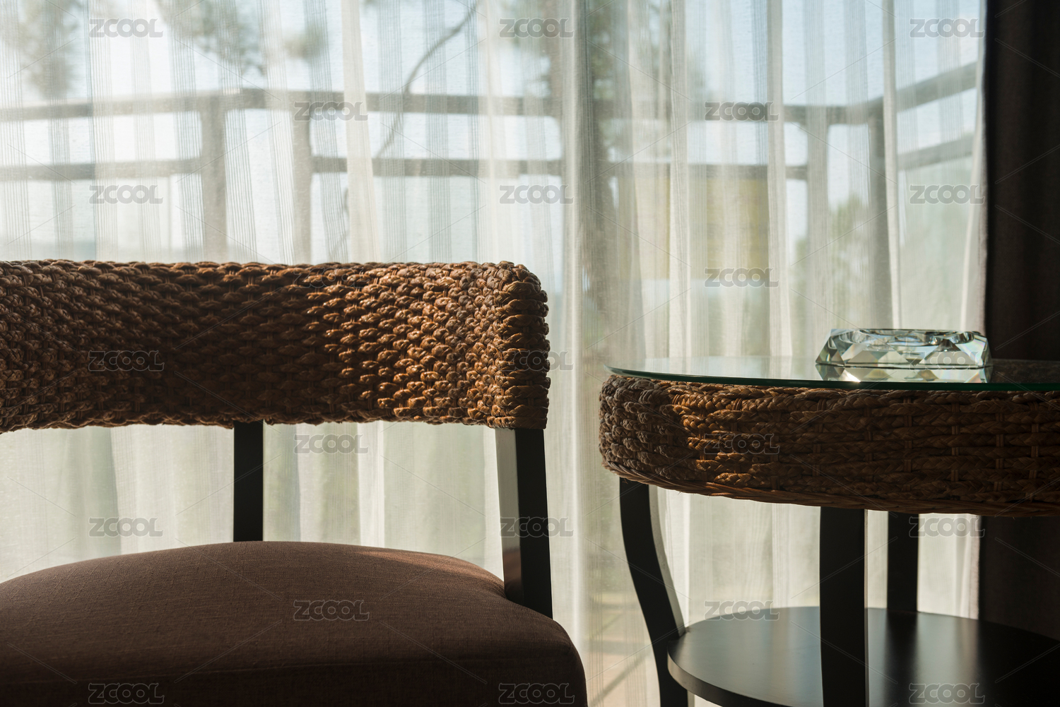 落地窗前的传统手工藤椅和茶几