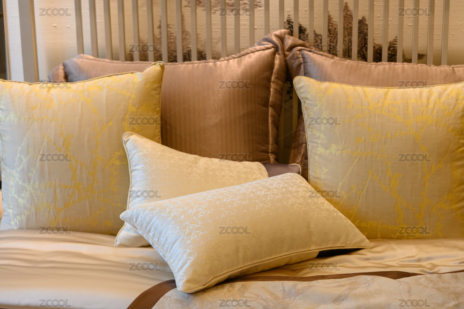 小床上摆放的三个大小颜色不一的枕头