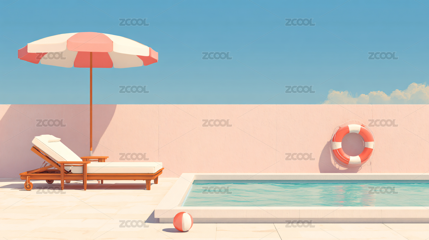 夏天白天阳光下游泳池遮阳伞沙滩椅3D插画
