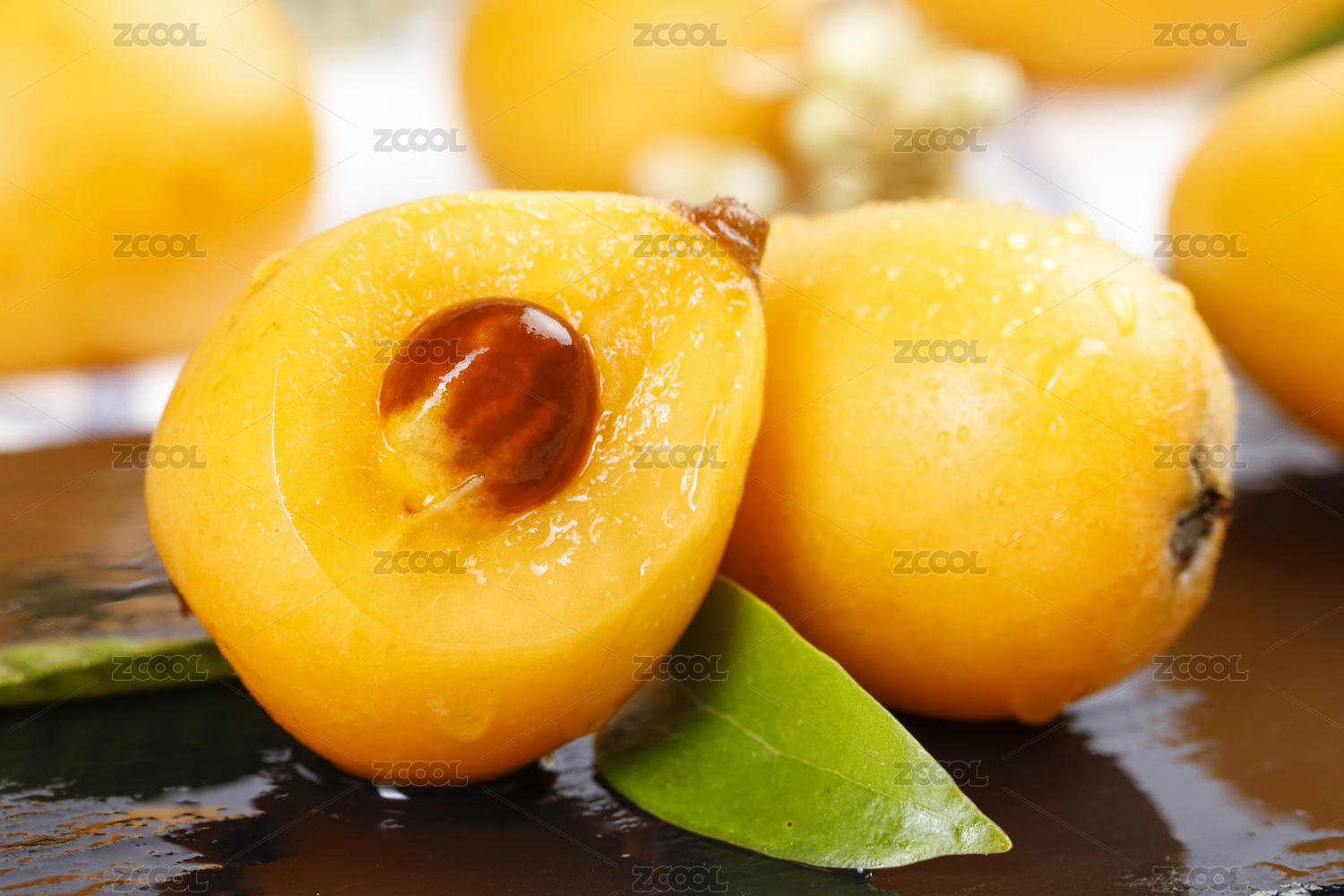 黑底上放着两个攀枝花枇杷和一个切开枇杷