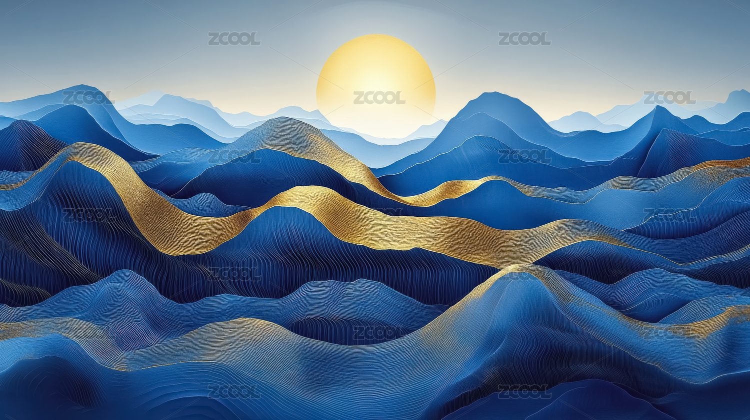 3D国风蓝色鎏金山脉中国山水风景插画