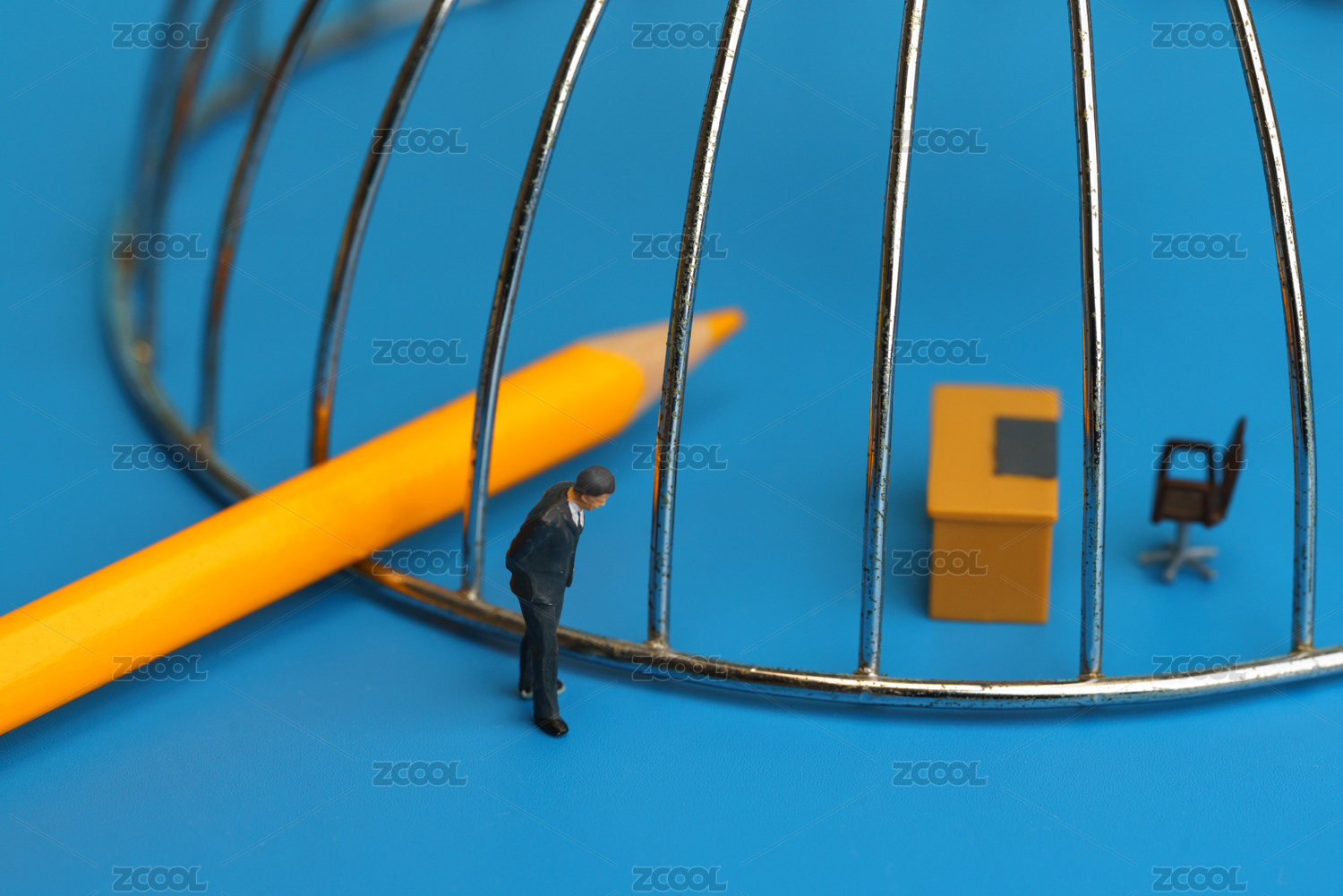 蓝色背景上牢笼中的办公桌和铅笔和焦虑的男
