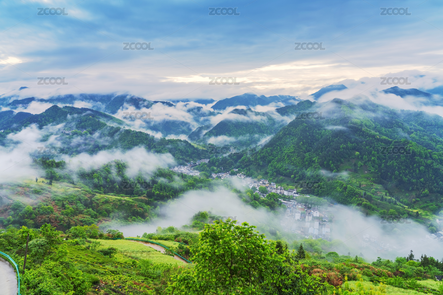 中国安徽省的大洲源景区的高山峡谷和美丽村