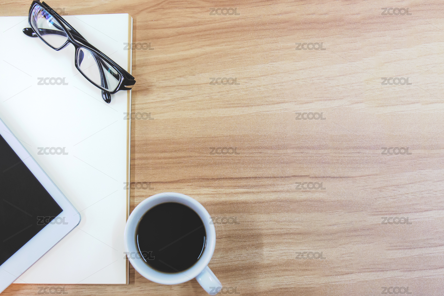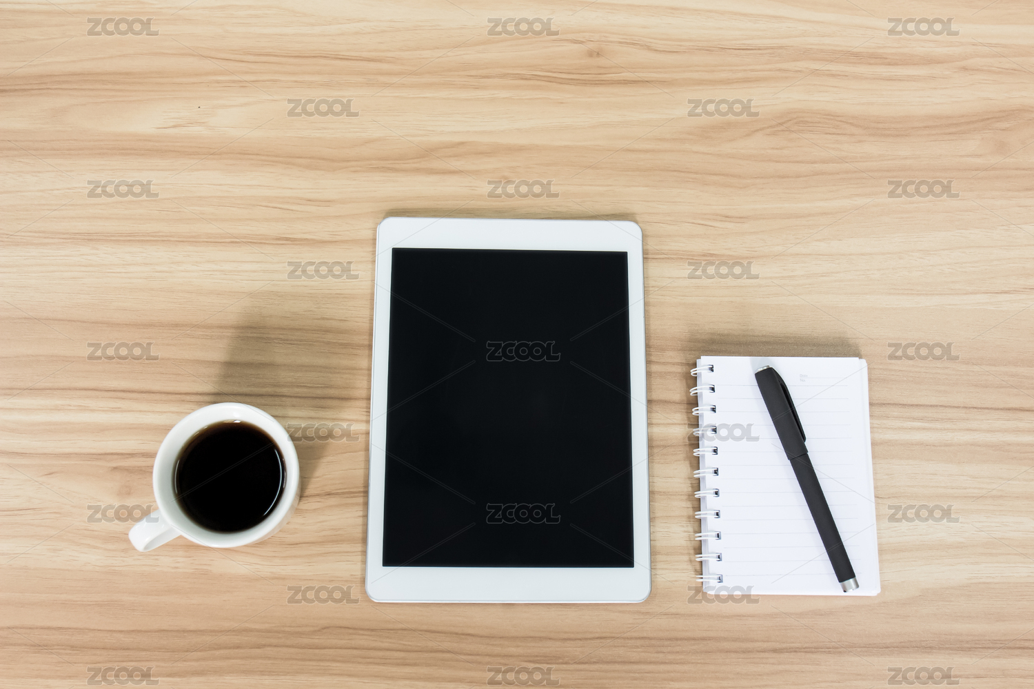 笔记本电脑平板笔记本和笔的咖啡桌子上的杯子
