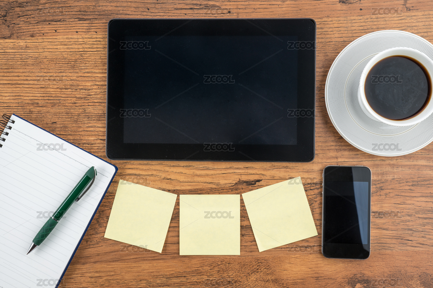平板电脑,粘性便签,笔记本电脑和智能手机用的咖啡杯