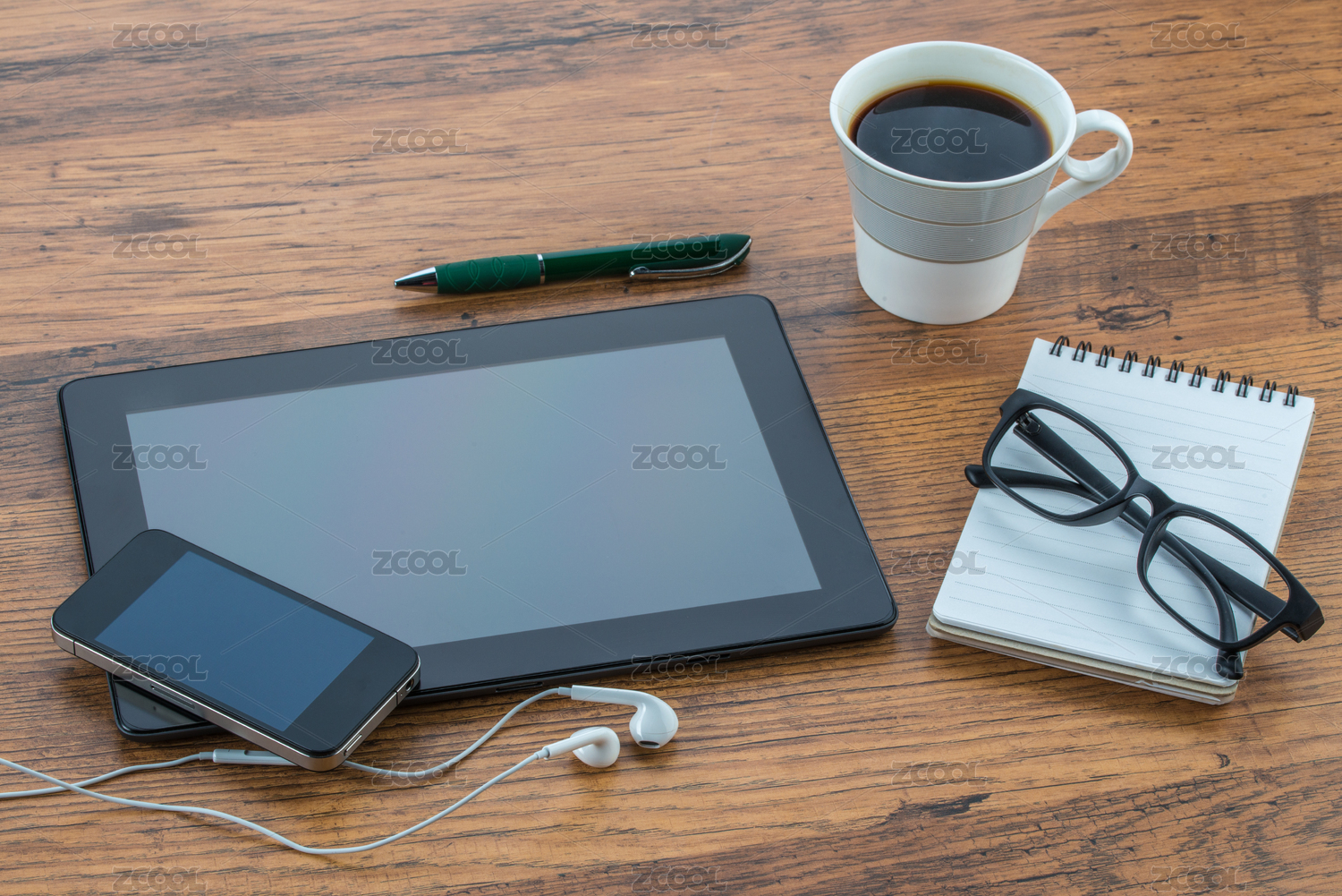 笔记本电脑手机和平板笔记本和咖啡的桌子上的杯子
