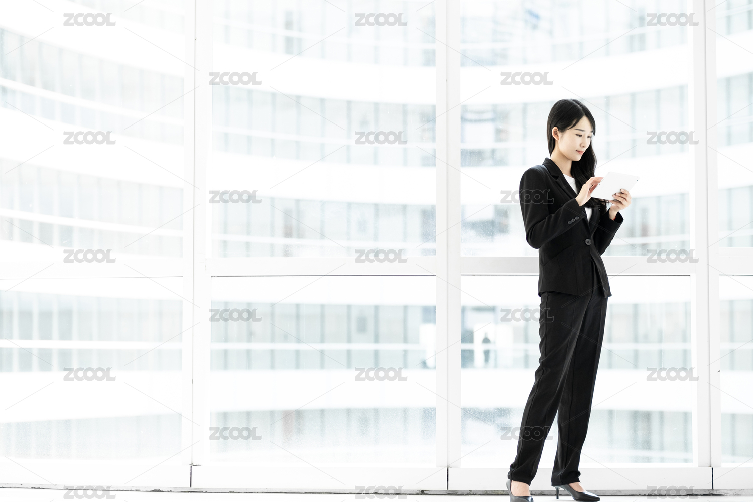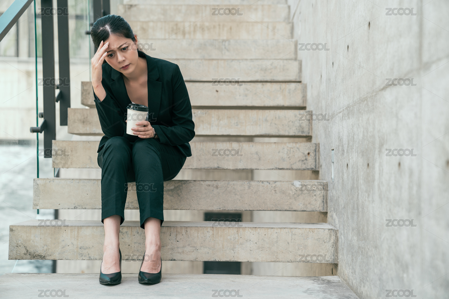 专业年轻的亚裔女子站在楼梯短信消息,她的客户在室外。