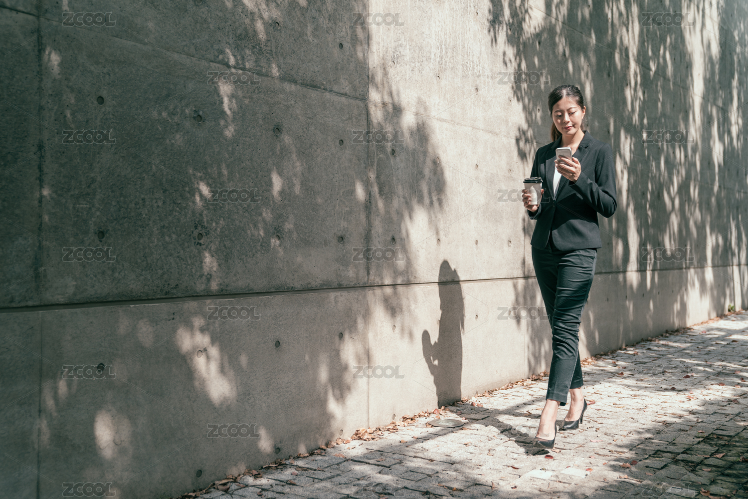 优雅的管理者权利的女人走在灰色墙体户外走廊人行道和保持热咖啡一杯想在业余时间未来的工作计划。