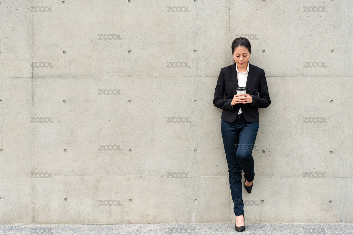 漂亮的西装合适的女子拿着白色的咖啡纸杯走在办公室以外的灰色的墙背景走道在工作空闲时间放松。